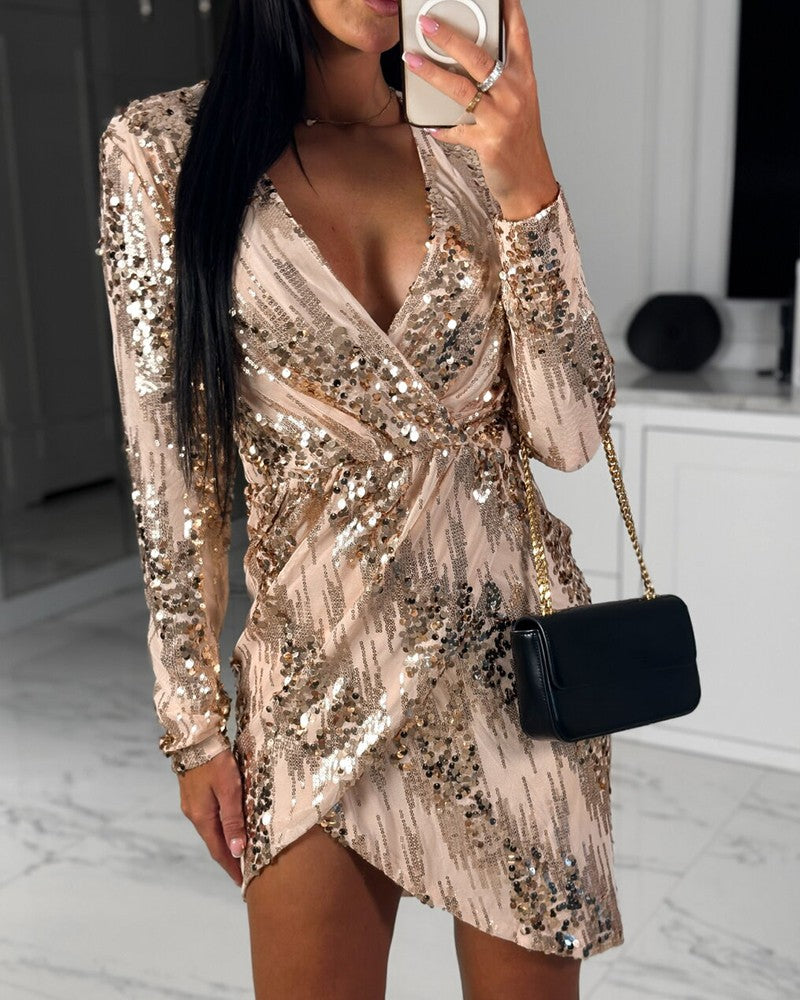 Ruched Plunge Long Sleeve Sequin Dress
