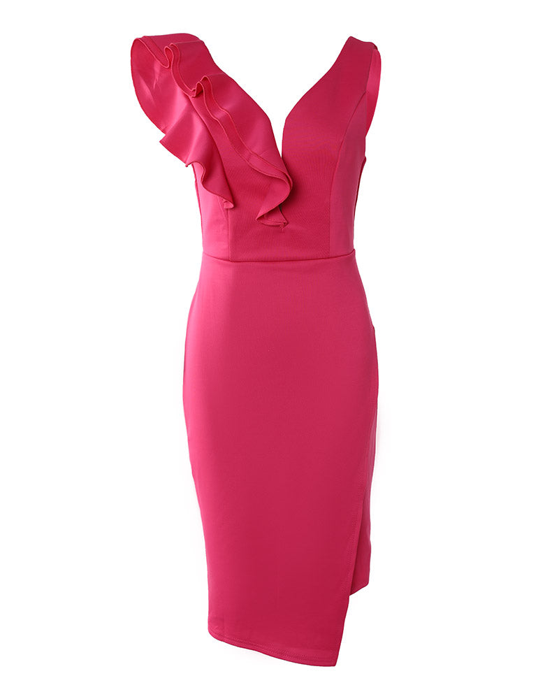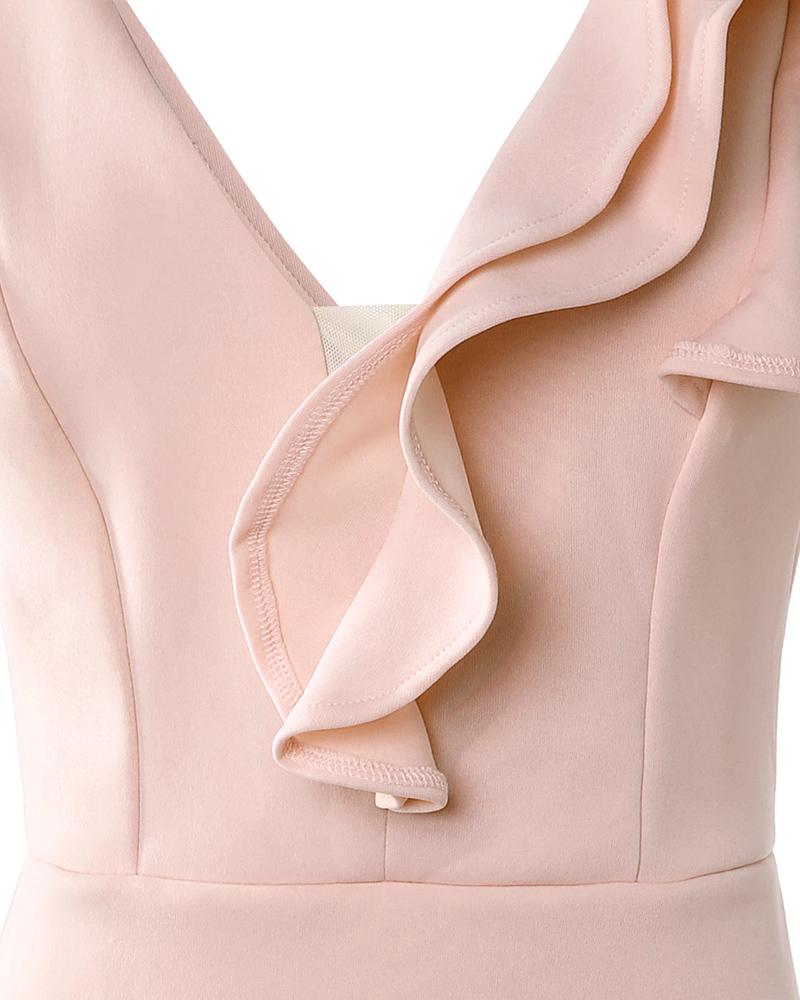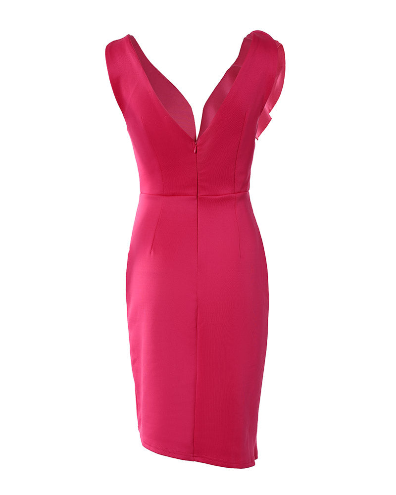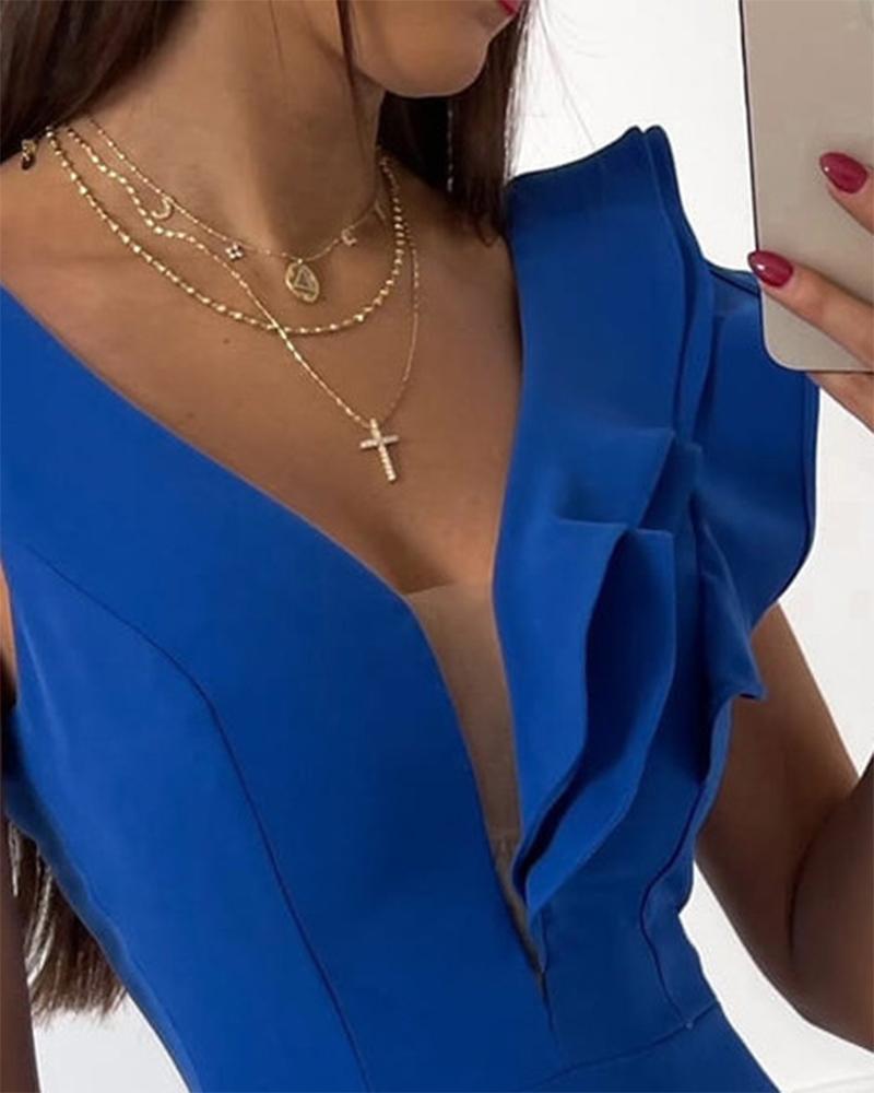 Ruffle Hem Contrast Mesh Plunging Neck Party Dress