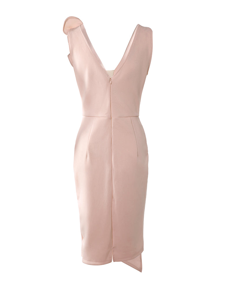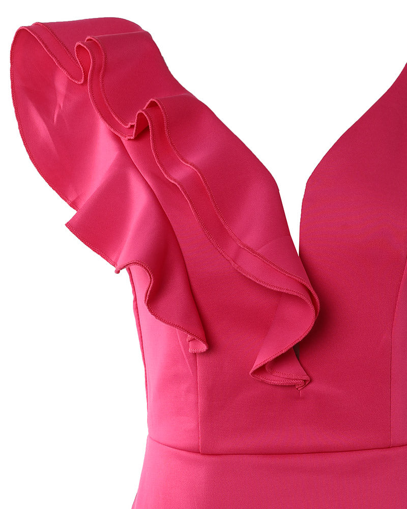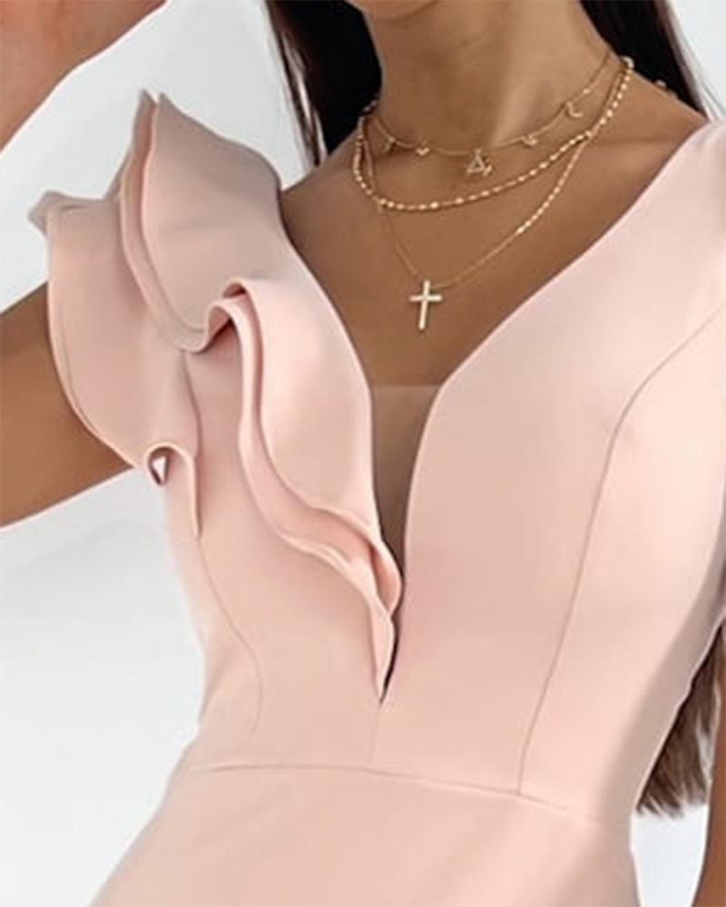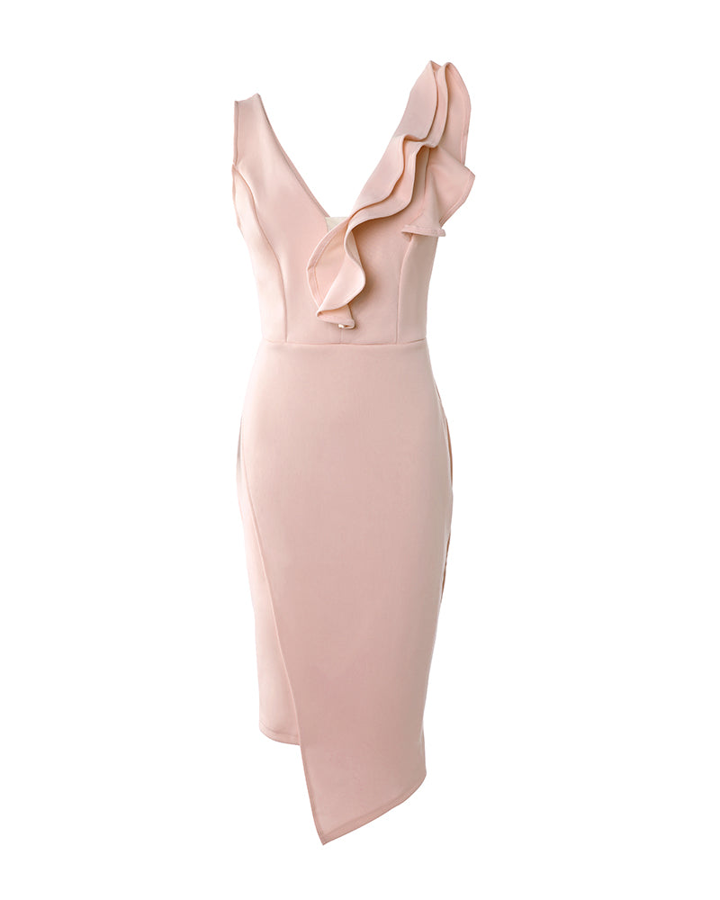 Ruffle Hem Contrast Mesh Plunging Neck Party Dress