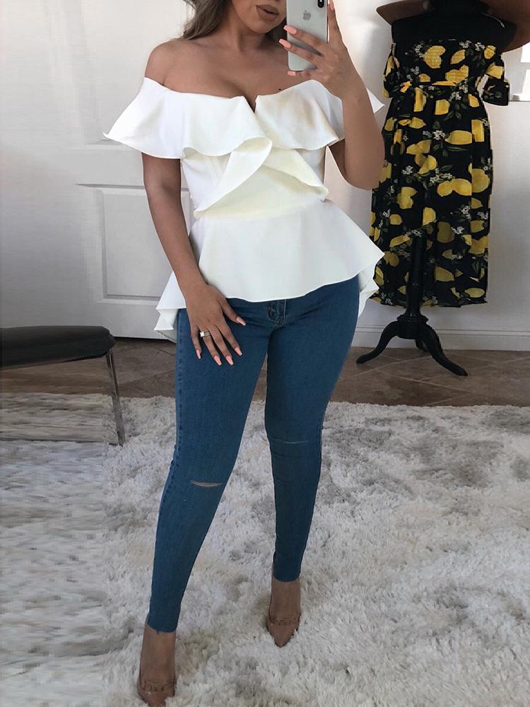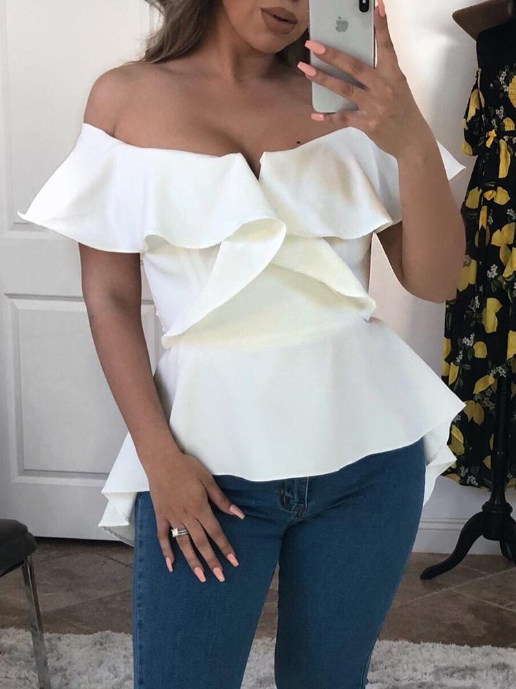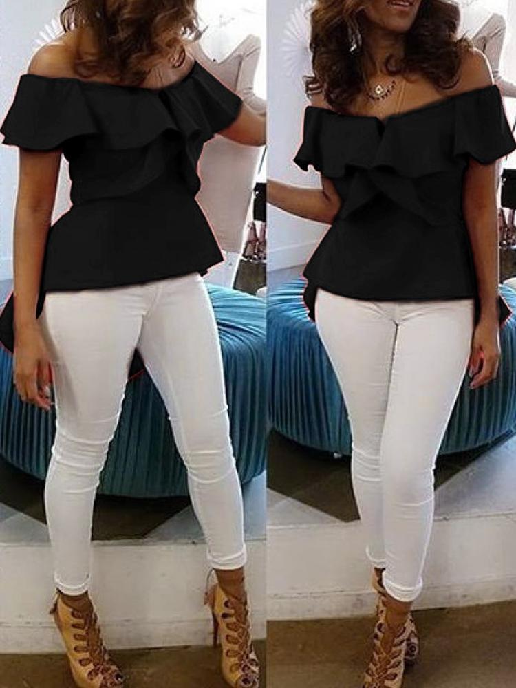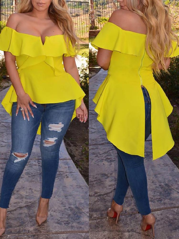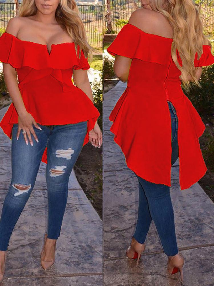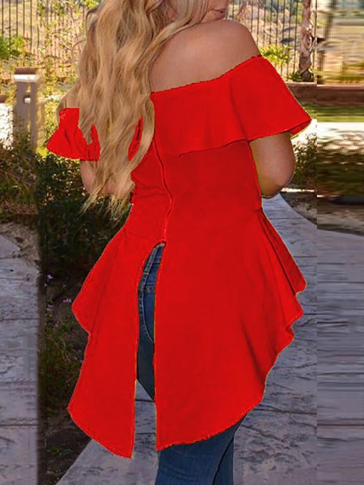 Ruffle Off Shoulder Split Back Hi Lo Hem Blouse