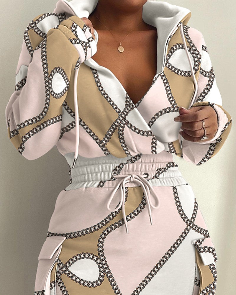 Scarf Chain Print Drawstring Hooded Sweatshirt Dress