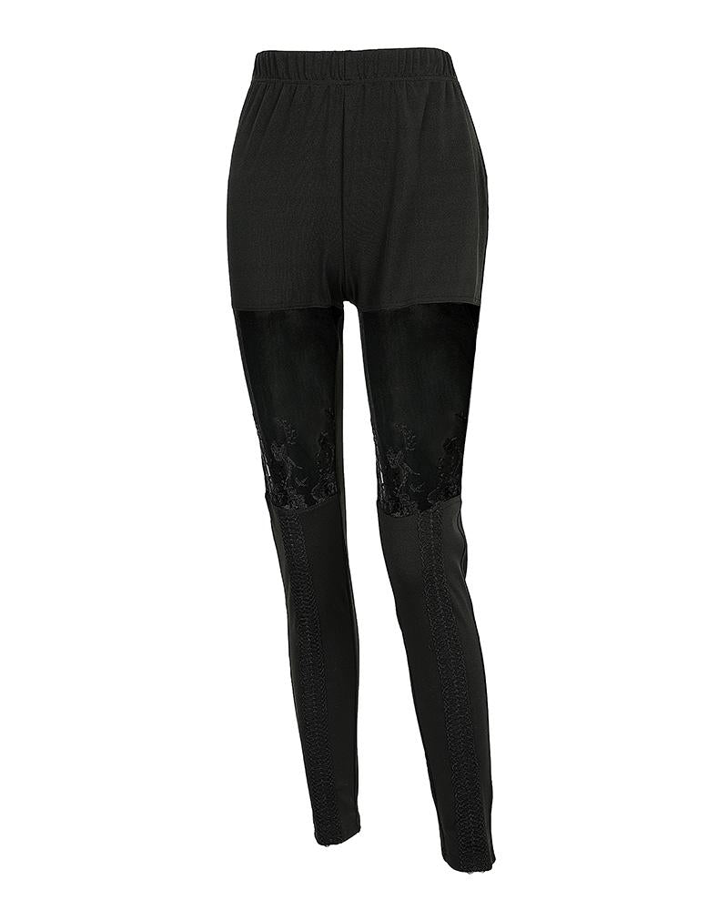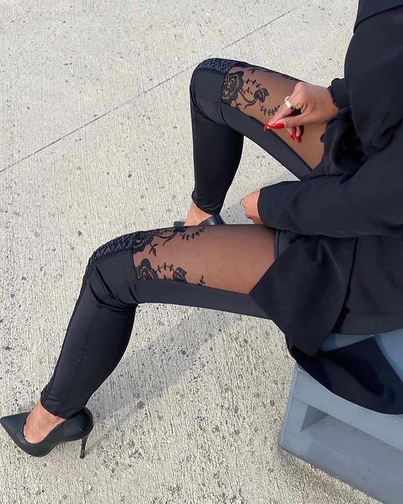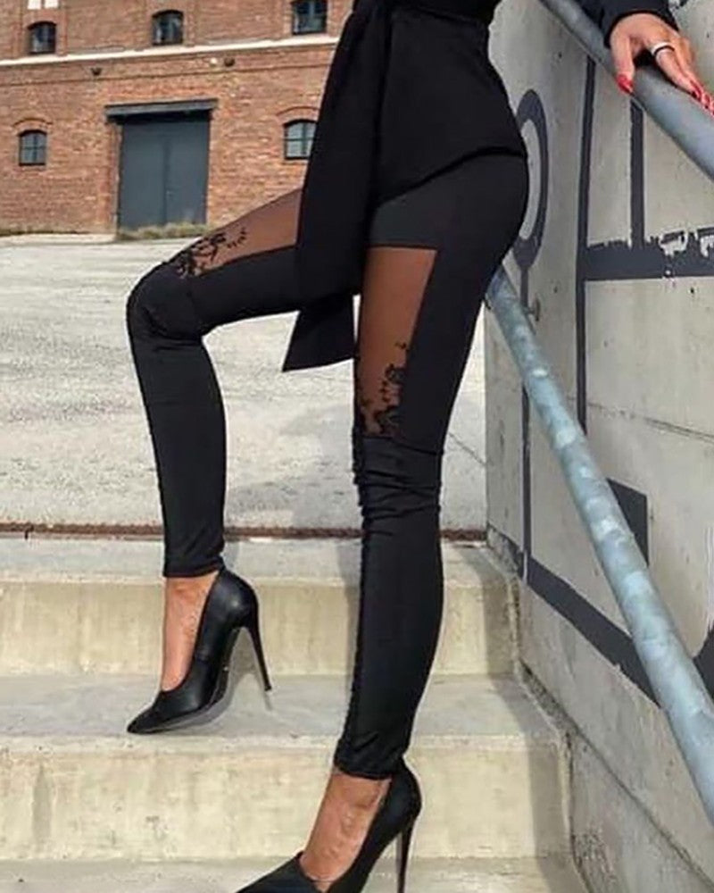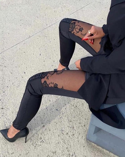 Sheer Mesh Lace Embroidery Patch Skinny Pants