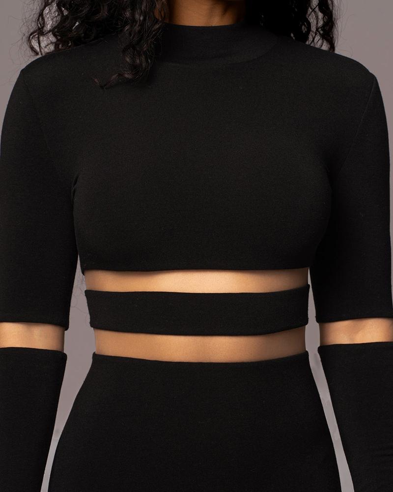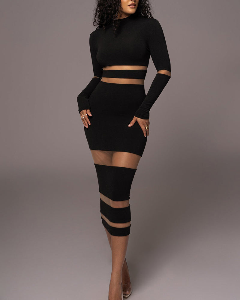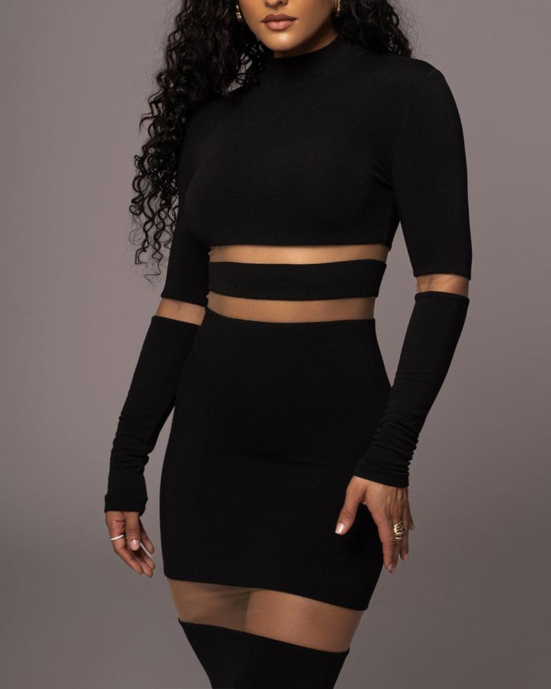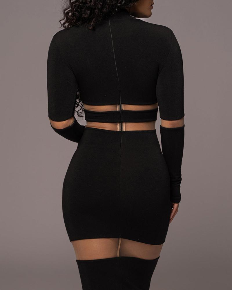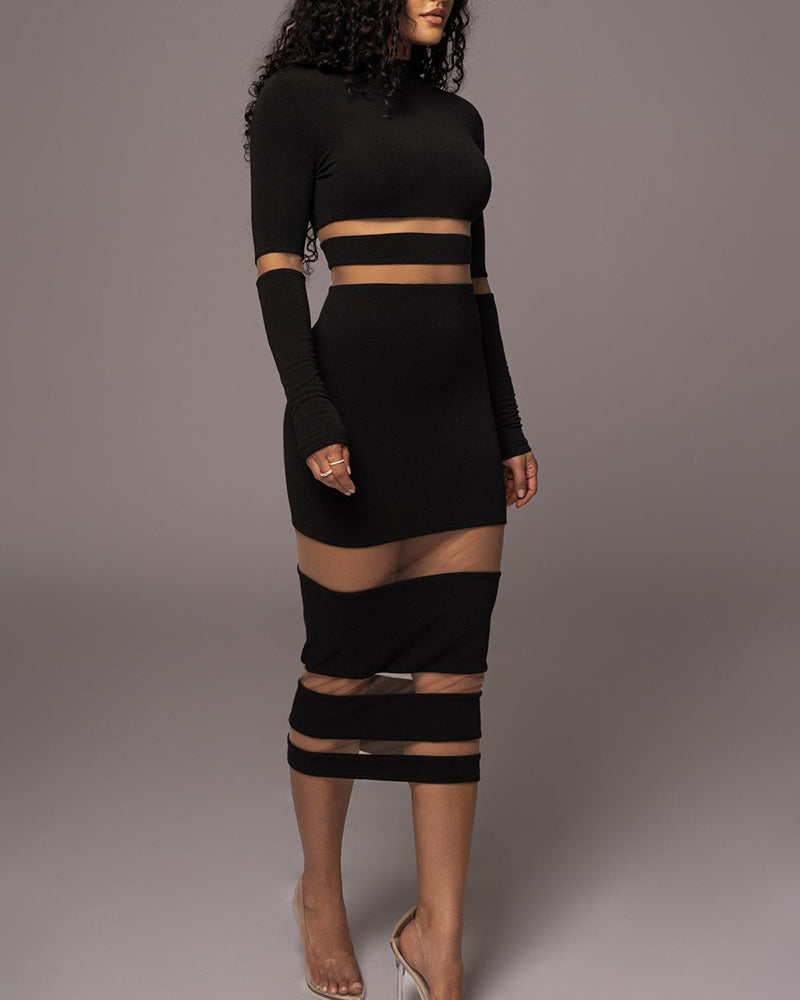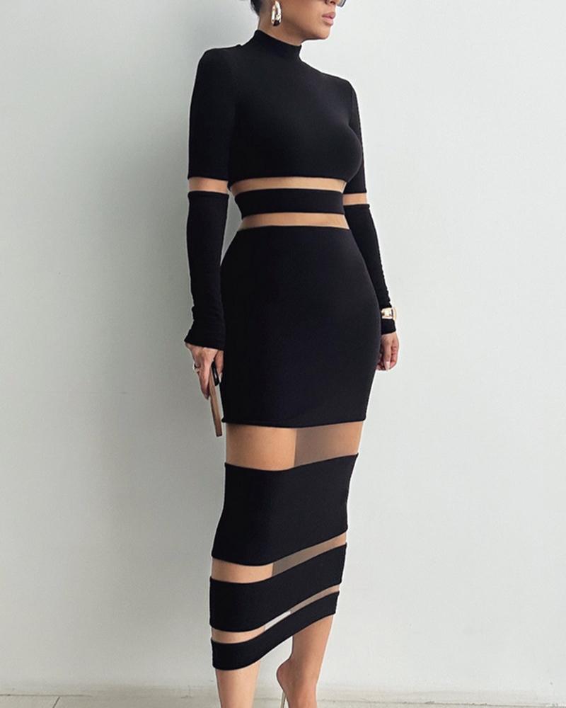 Sheer Mesh Patchwork Mock Neck Midi Dress