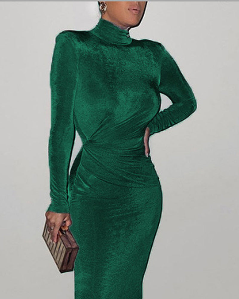 Shoulder Pad Long Sleeve Ruched Skinny Maxi Dress