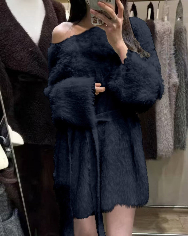 Skew Neck Faux Fur Tied Detail Long Sleeve Sweater Winter Top