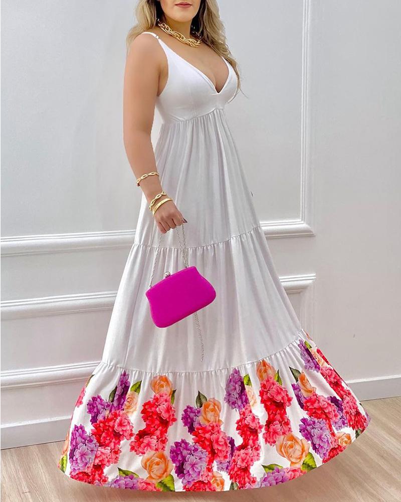 Sleeveless Plunge Ruched Floral Print Maxi Dress