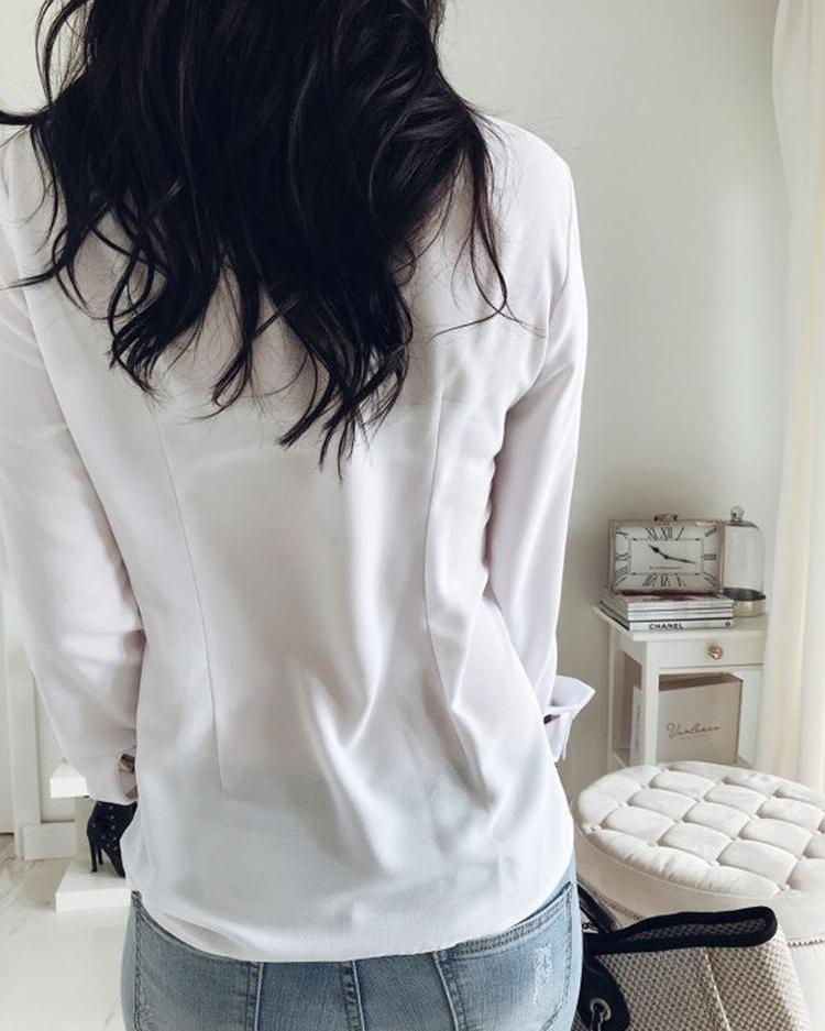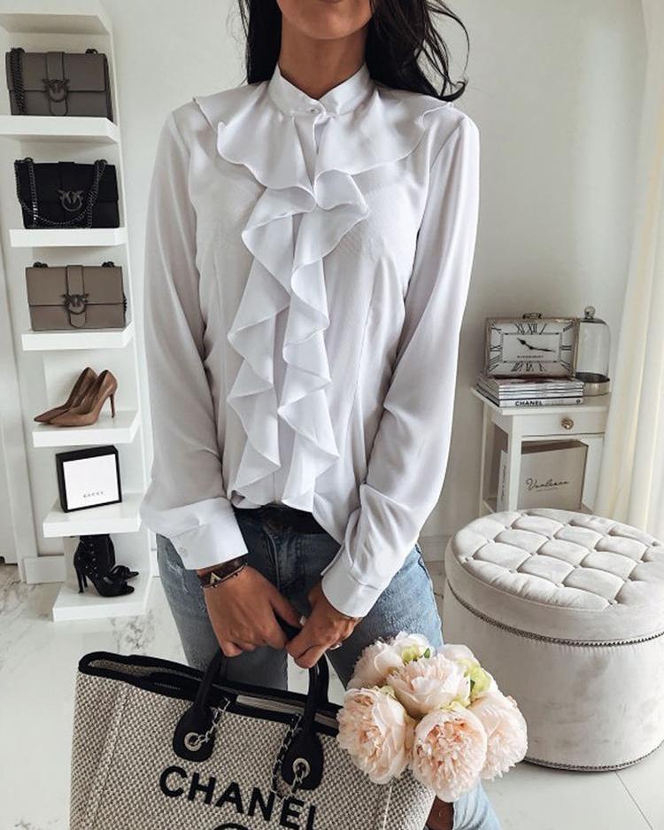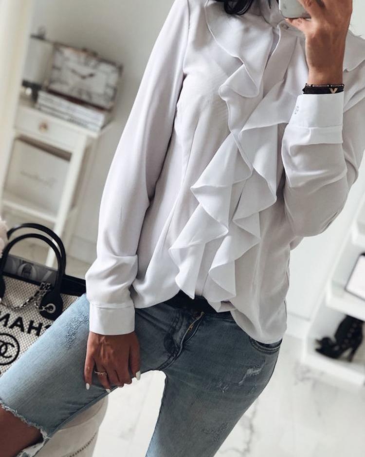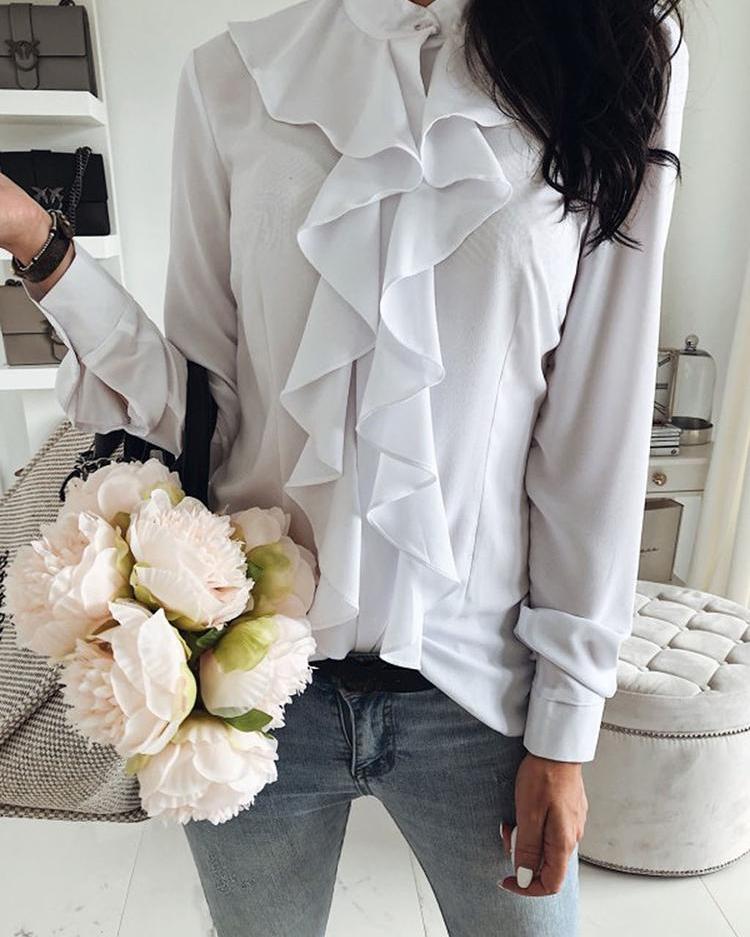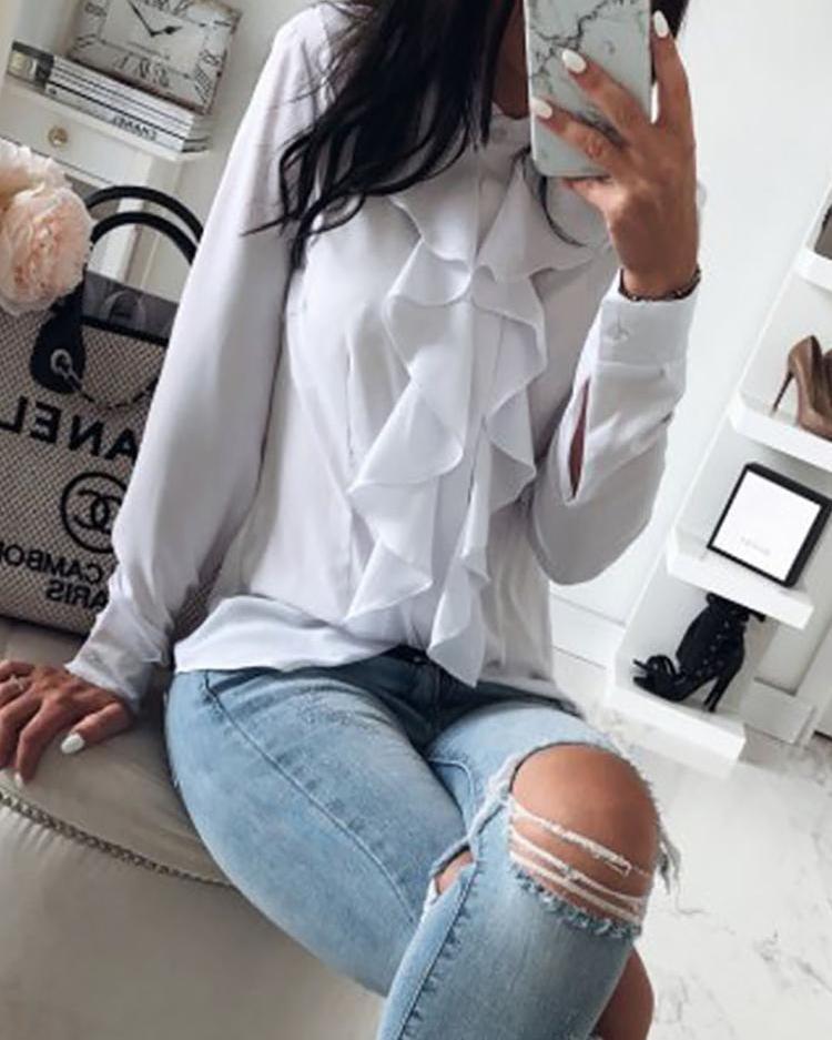 Solid Ruffles Design Long Sleeve Casual Blouse