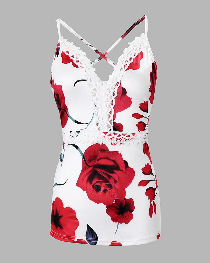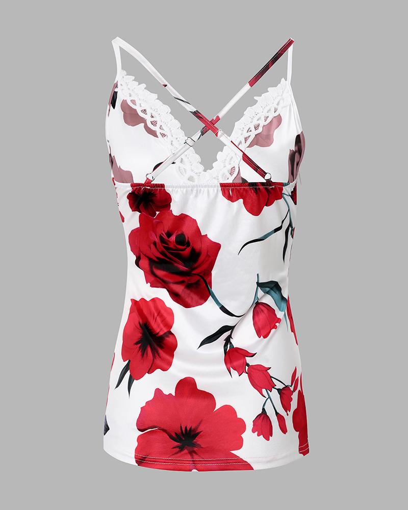 Spaghetti Strap Lace Trim Floral Print Top