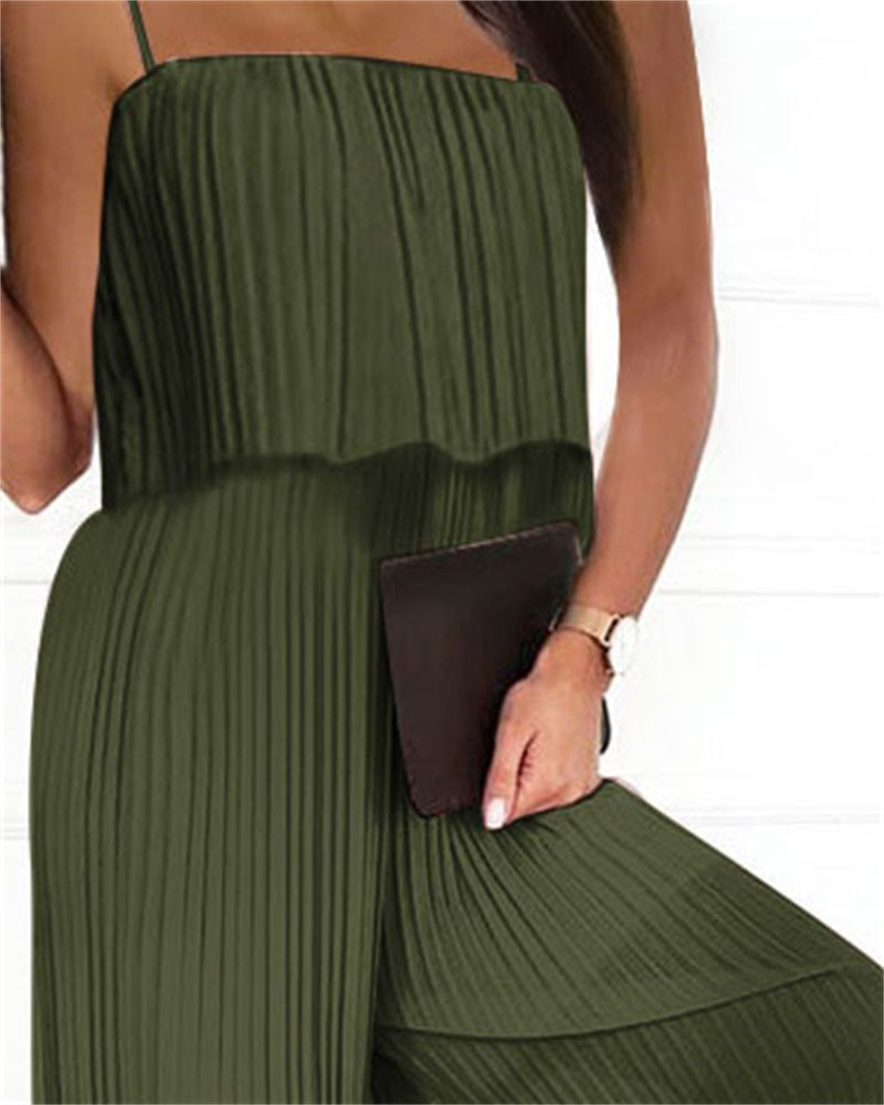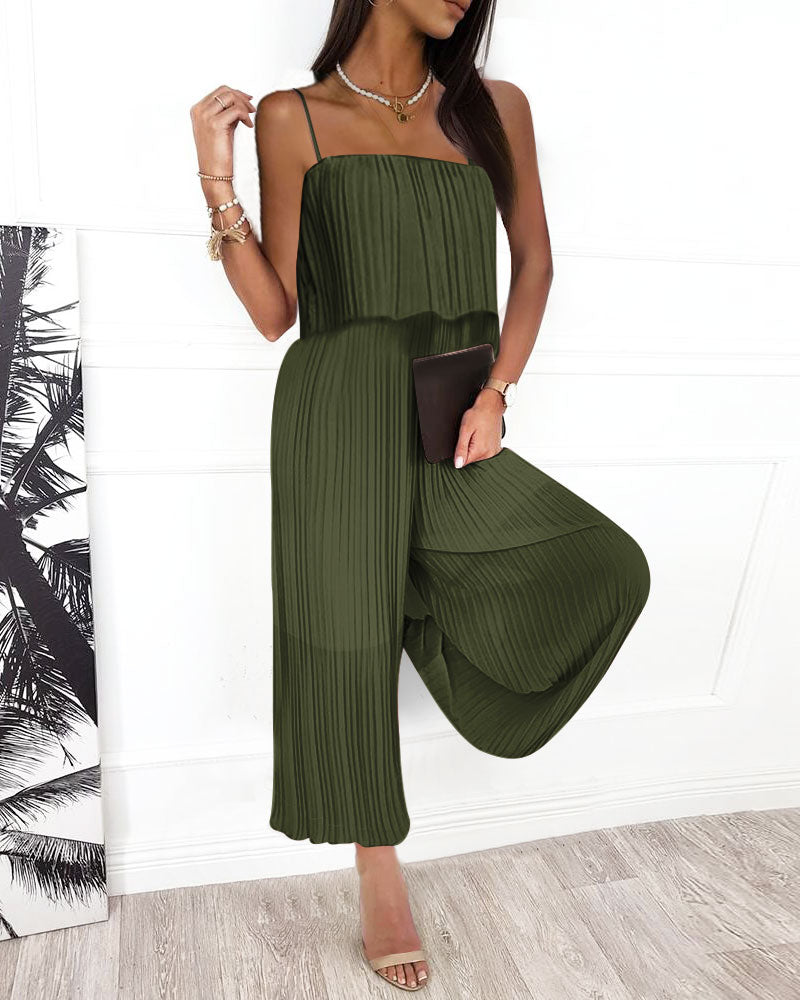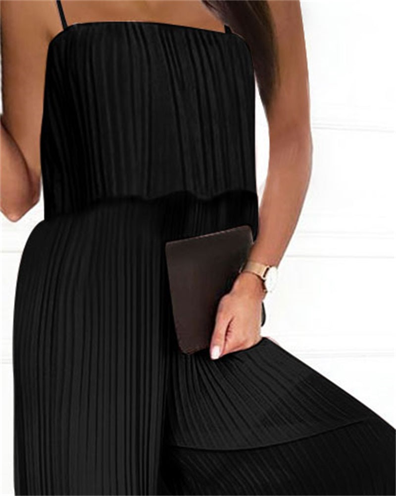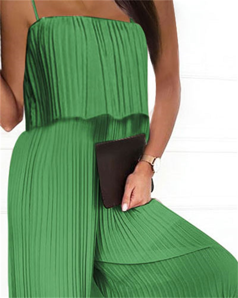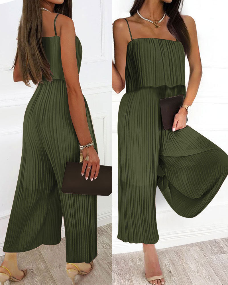 Spaghetti Strap Ruffle Hem Pleated Wide Leg Jumpsuit