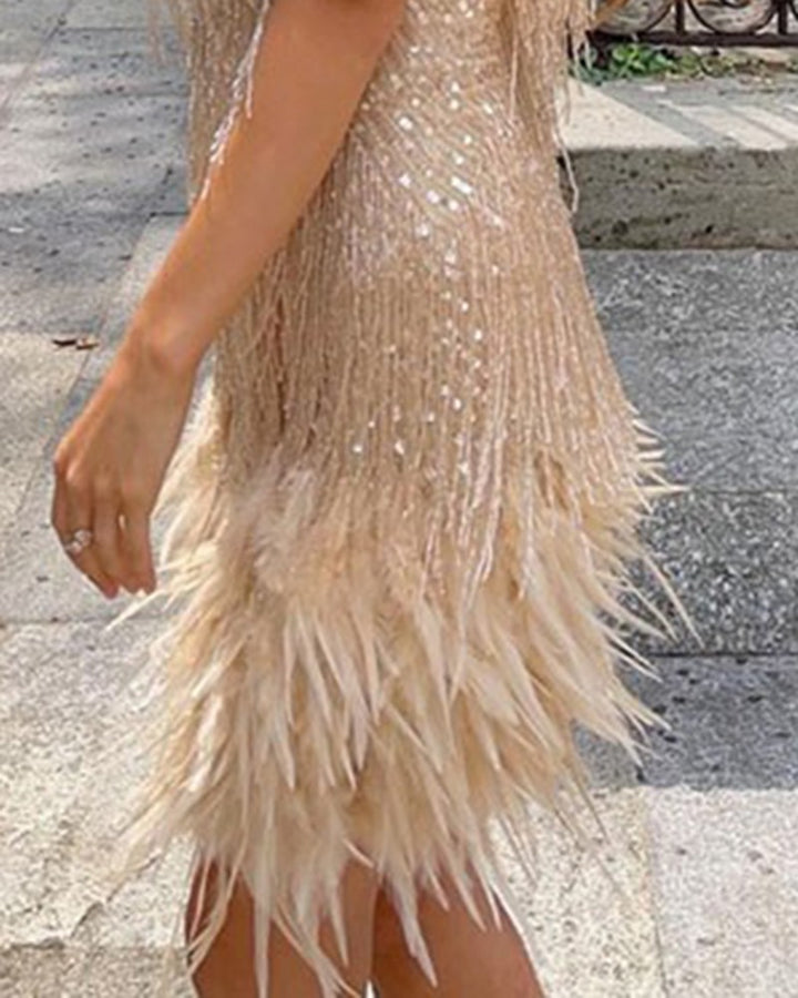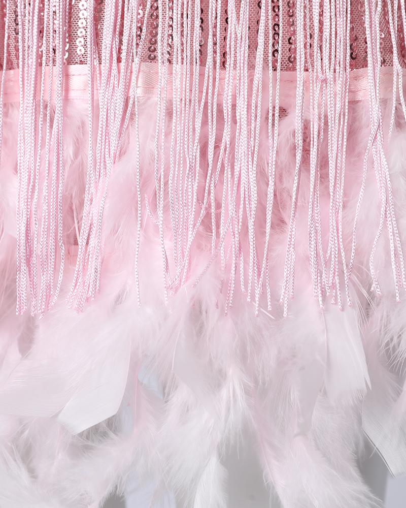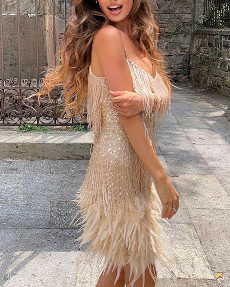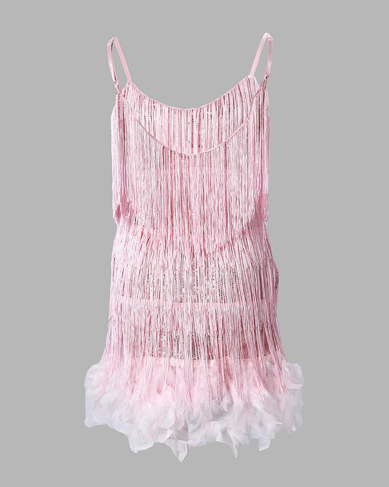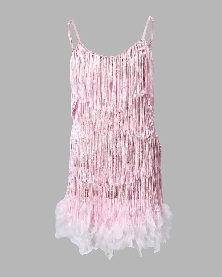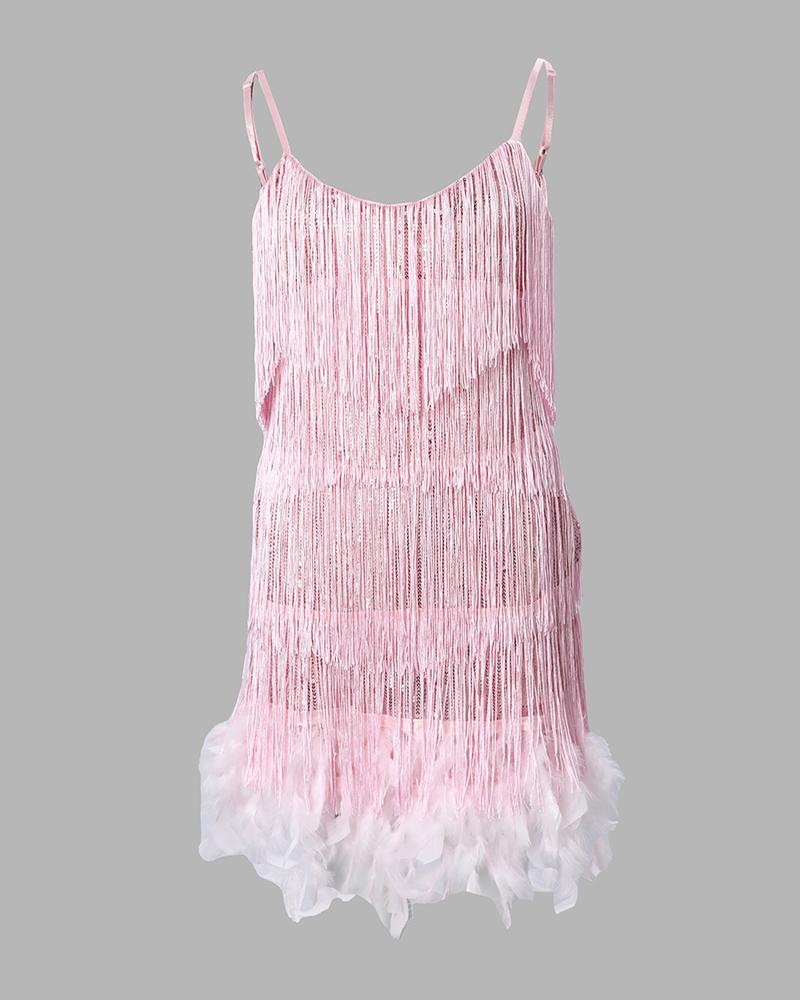Spaghetti Strap Tassel Design Feather Detail Party Dress