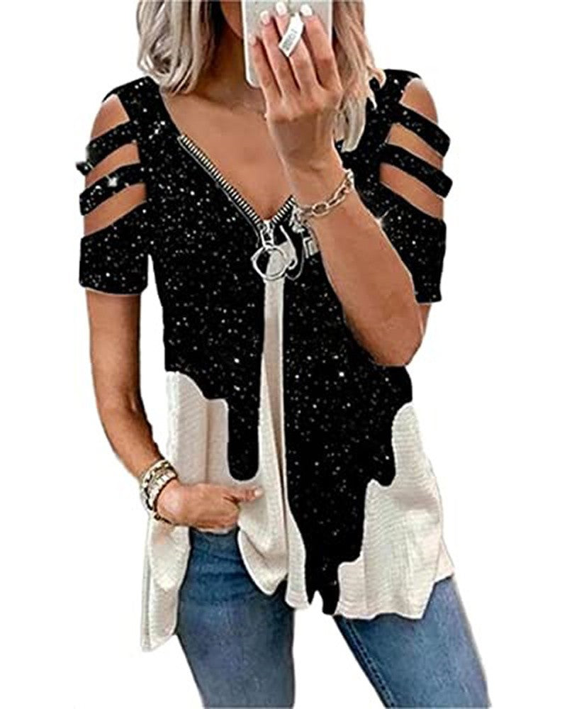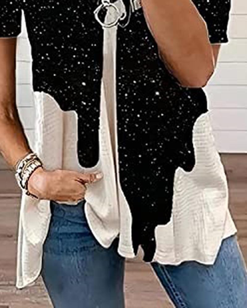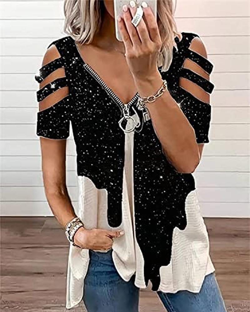 Sparkling Sky Print Zipper Design Cutout T shirt