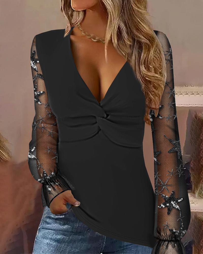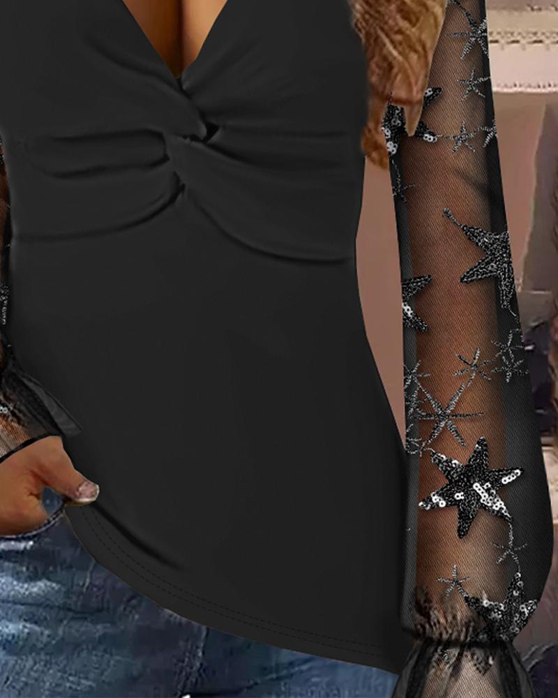Star Pattern Contrast Sequin Sheer Mesh Twisted Top