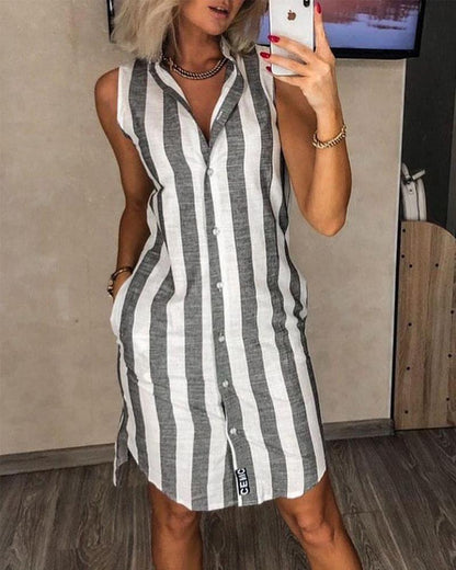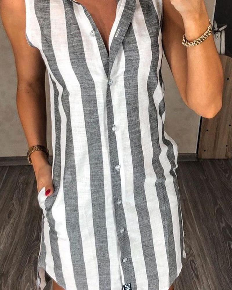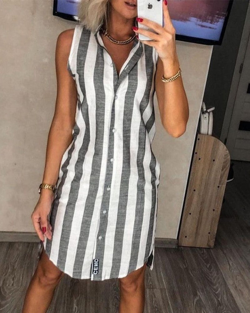 Stripe Print V neck Button Straight Vest Shirt Dress