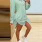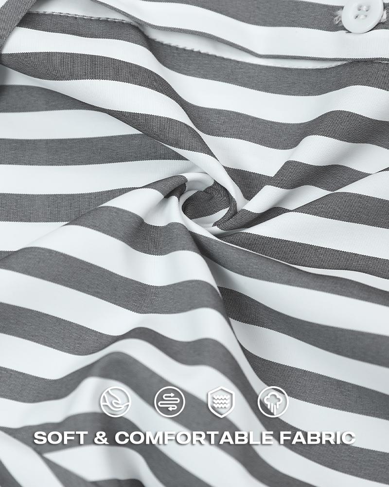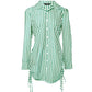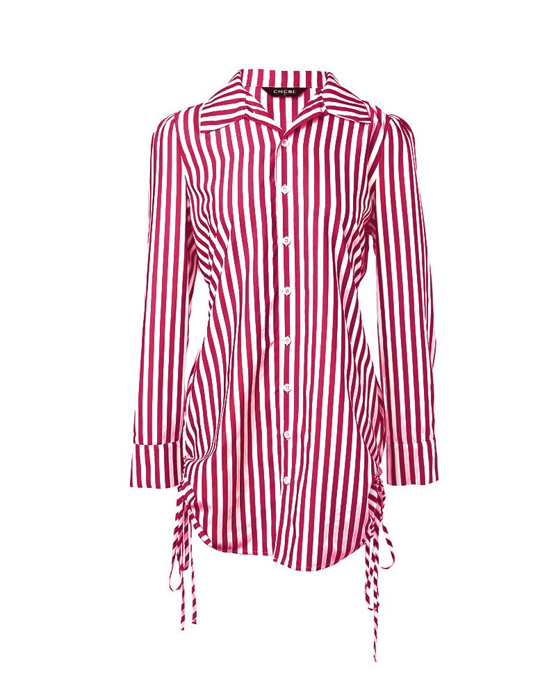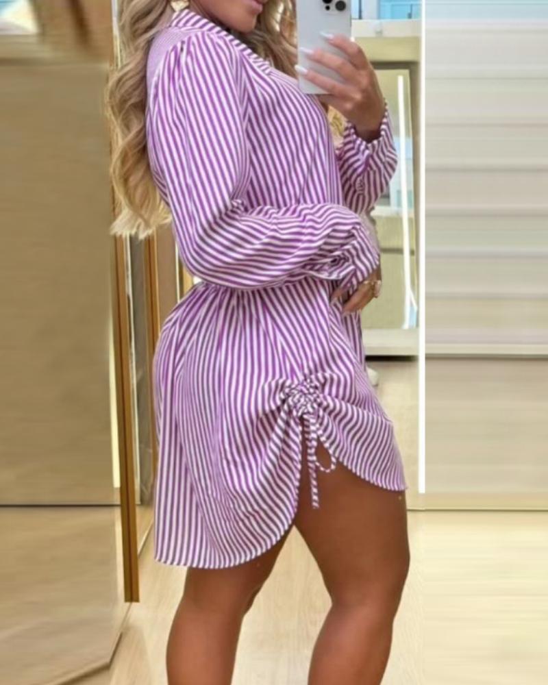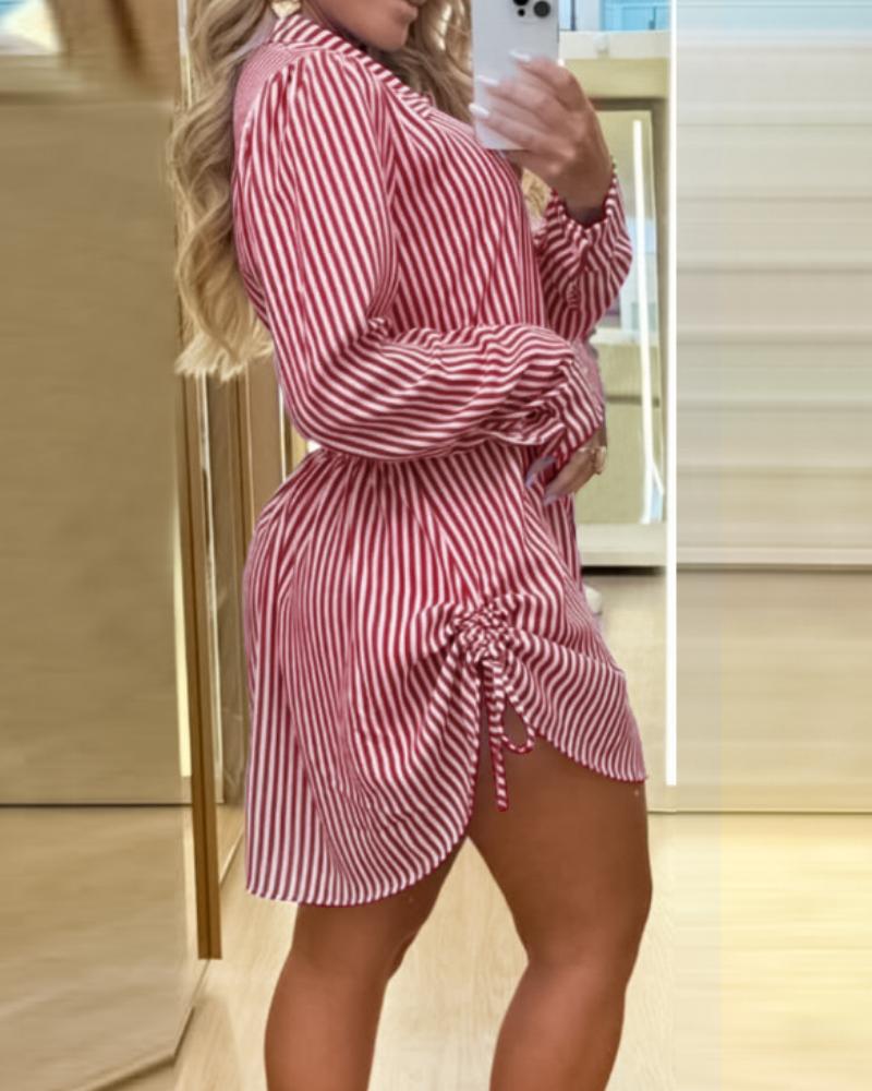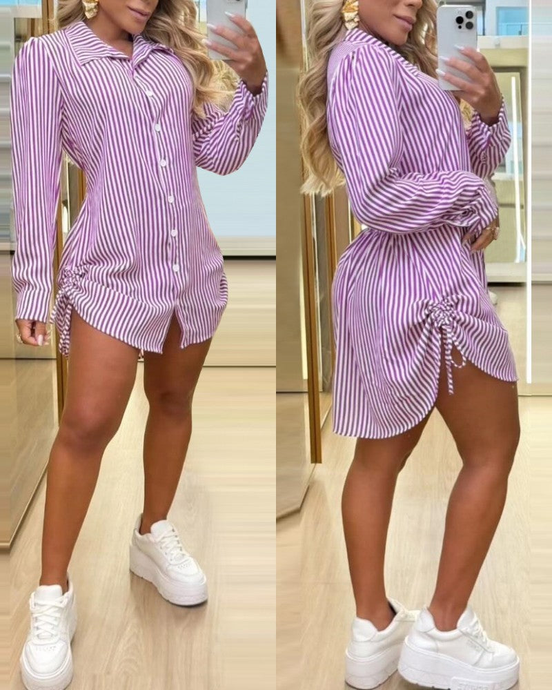 Striped Button Down Shirt Dress Back Shirred Long Sleeve Side Drawstring Mini Dresses