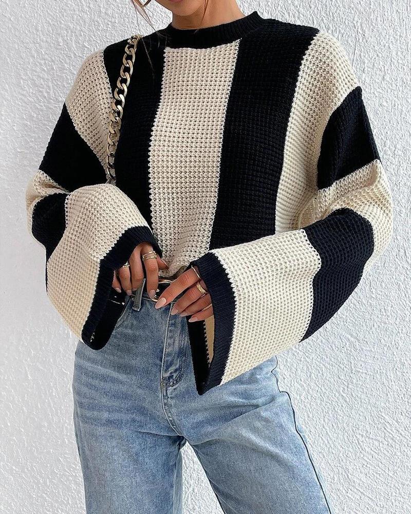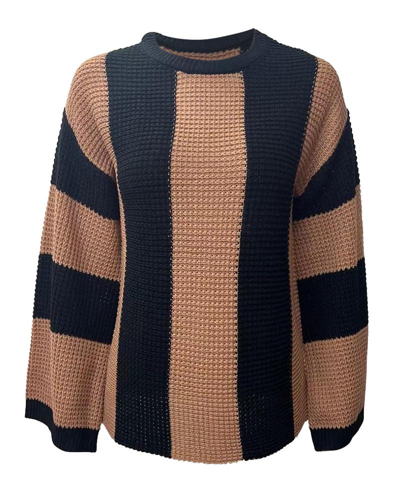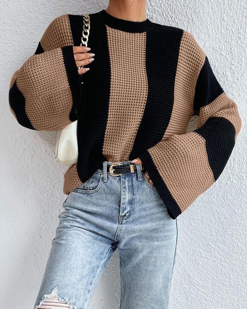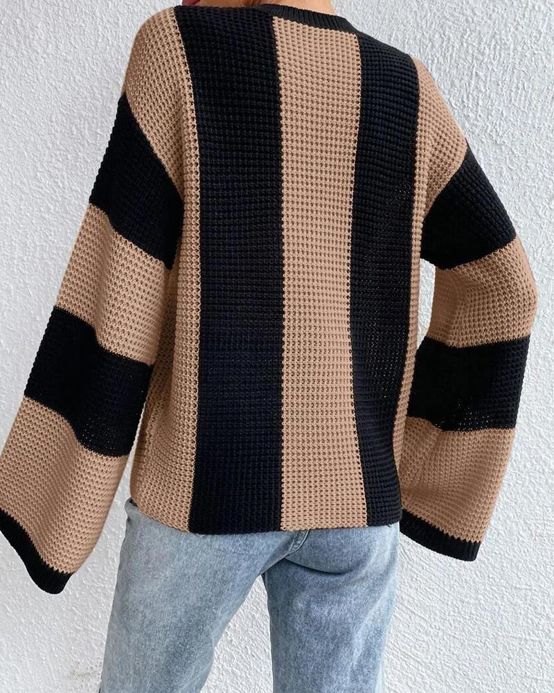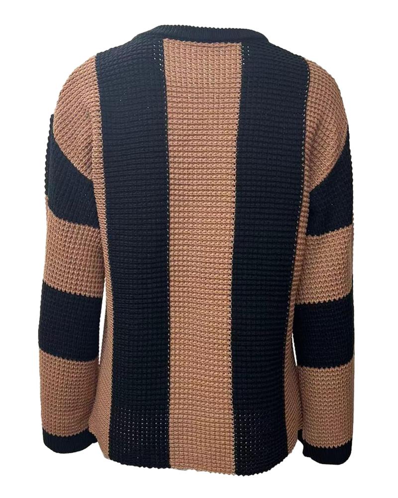 Striped Colorblock O Neck Knit Sweater