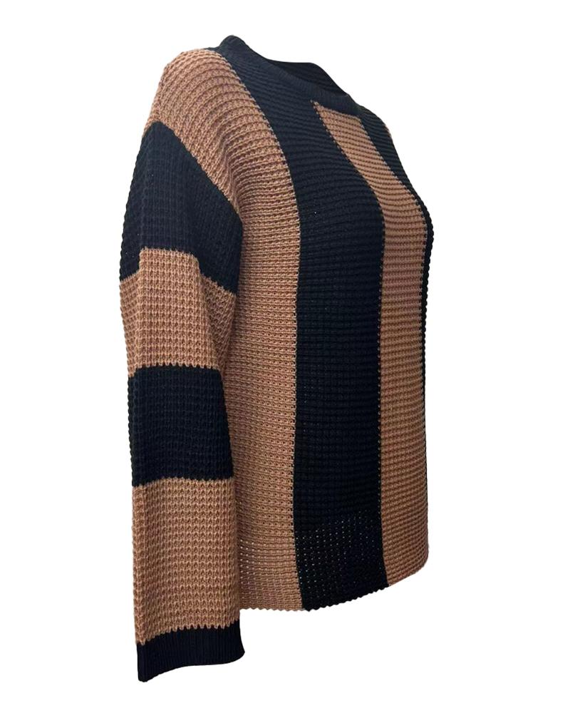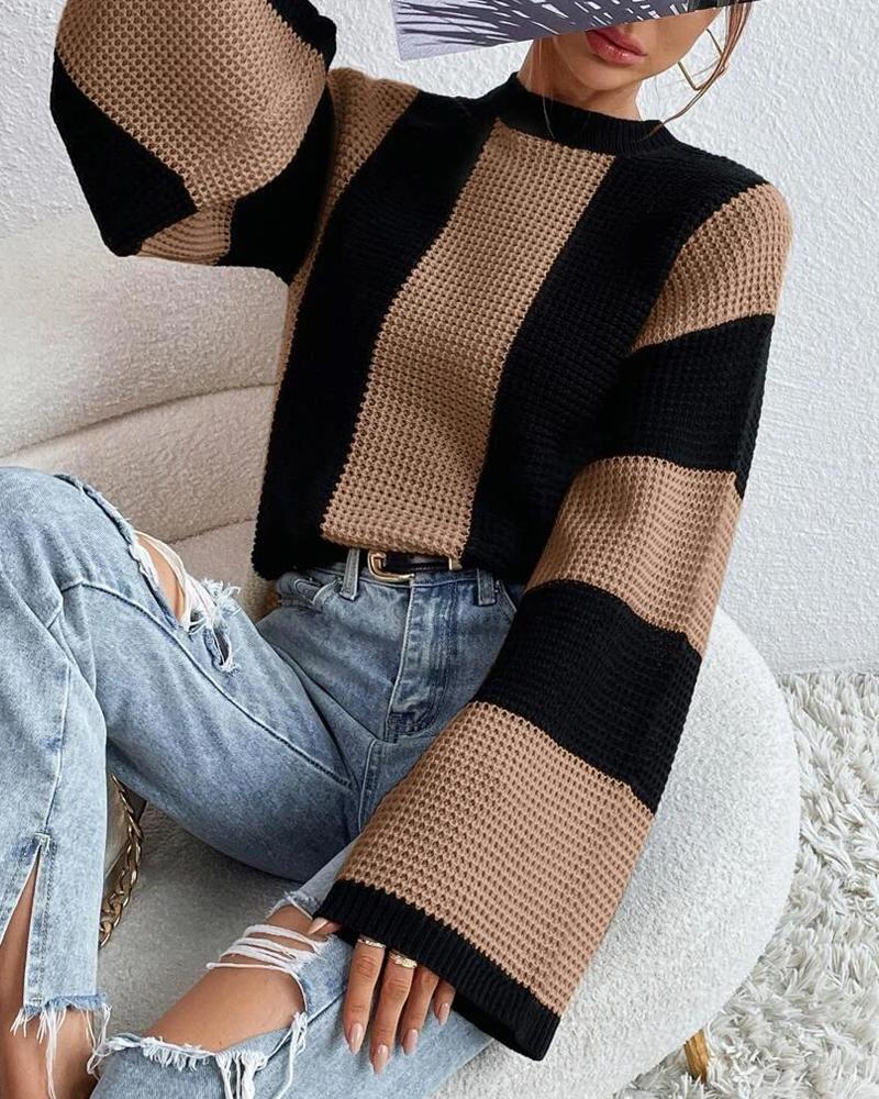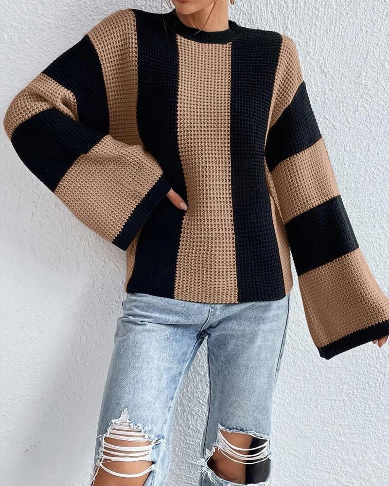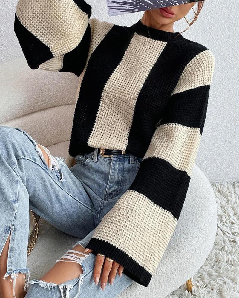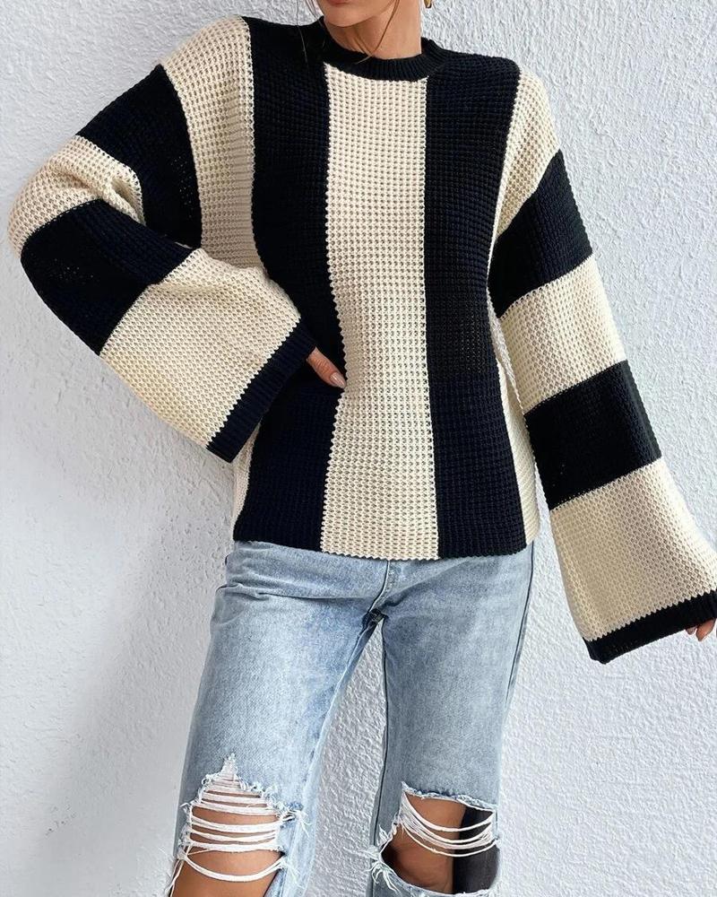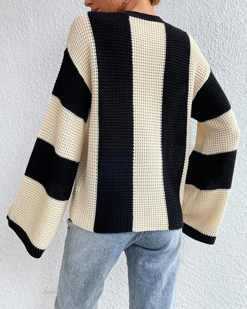 Striped Colorblock O Neck Knit Sweater