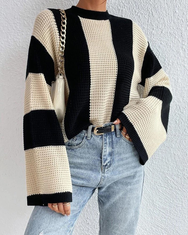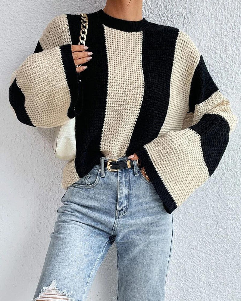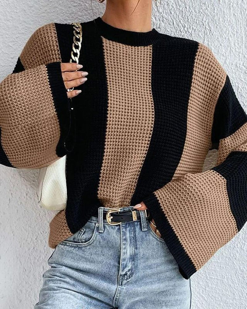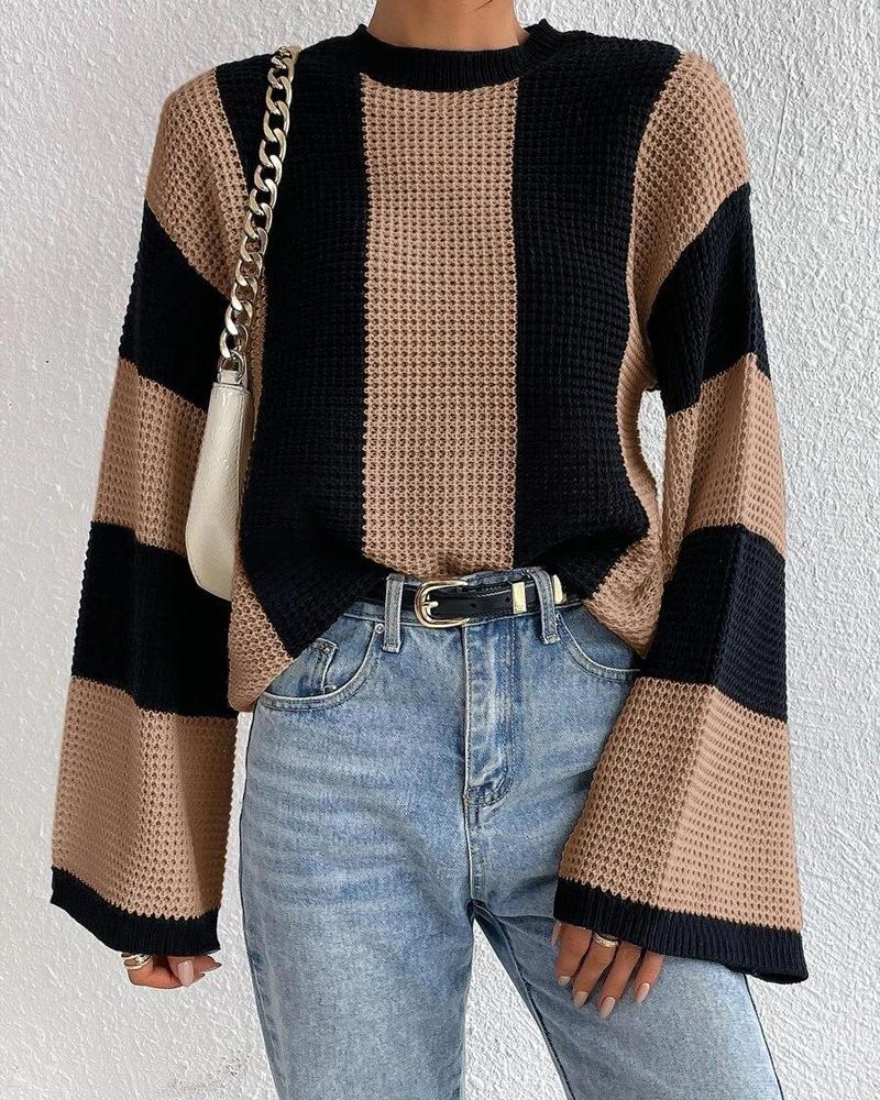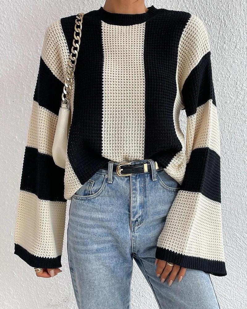 Striped Colorblock O Neck Knit Sweater