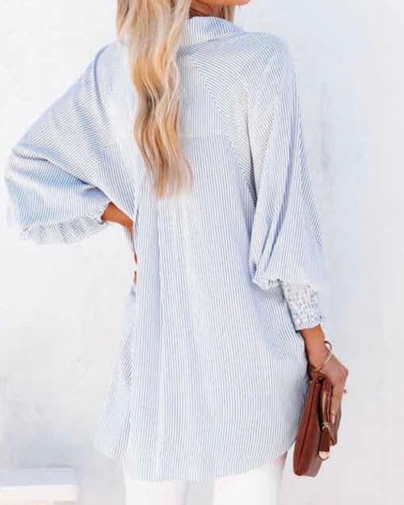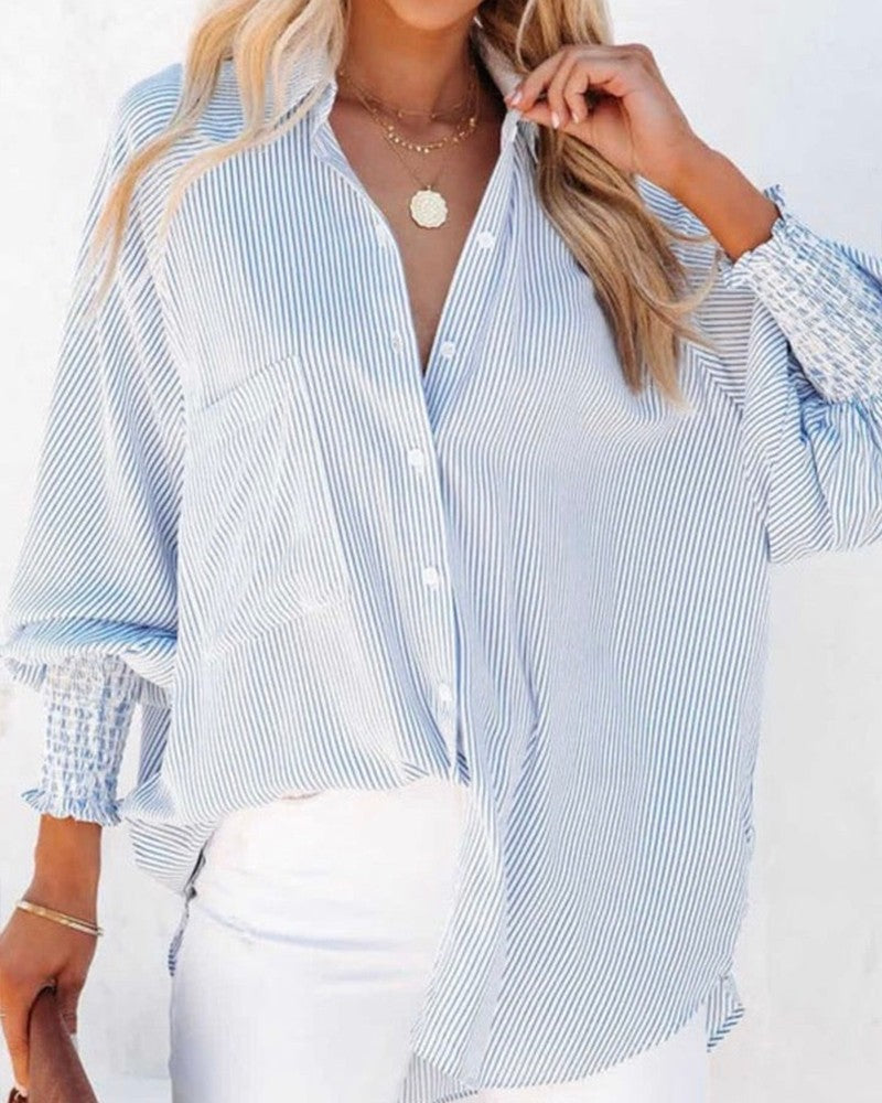 Striped Lantern Sleeve Shirred Button Down Pocket Design Shirt Top