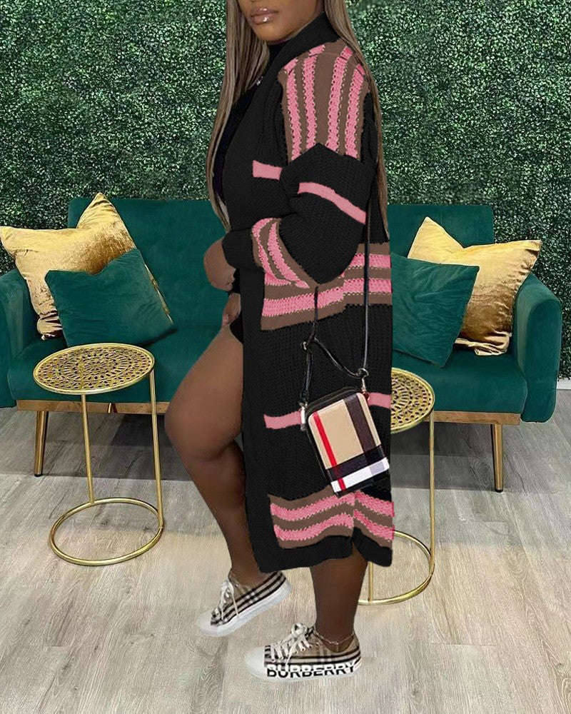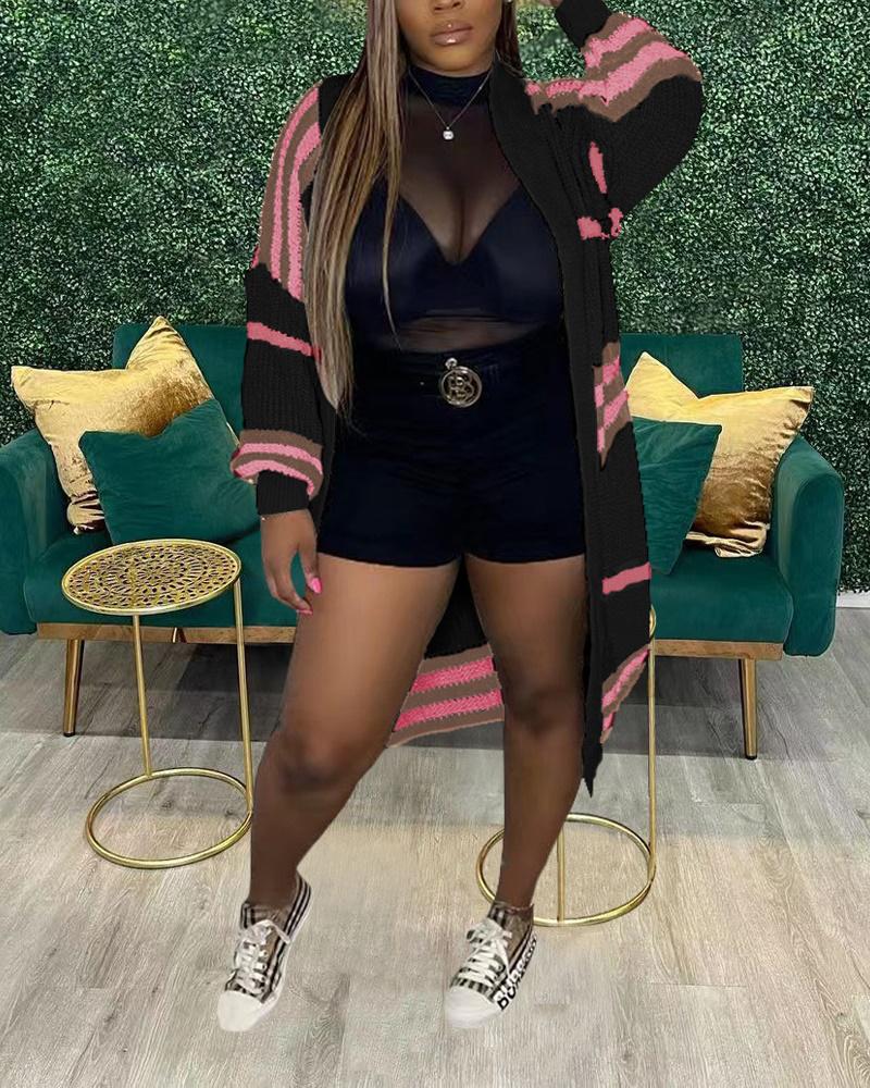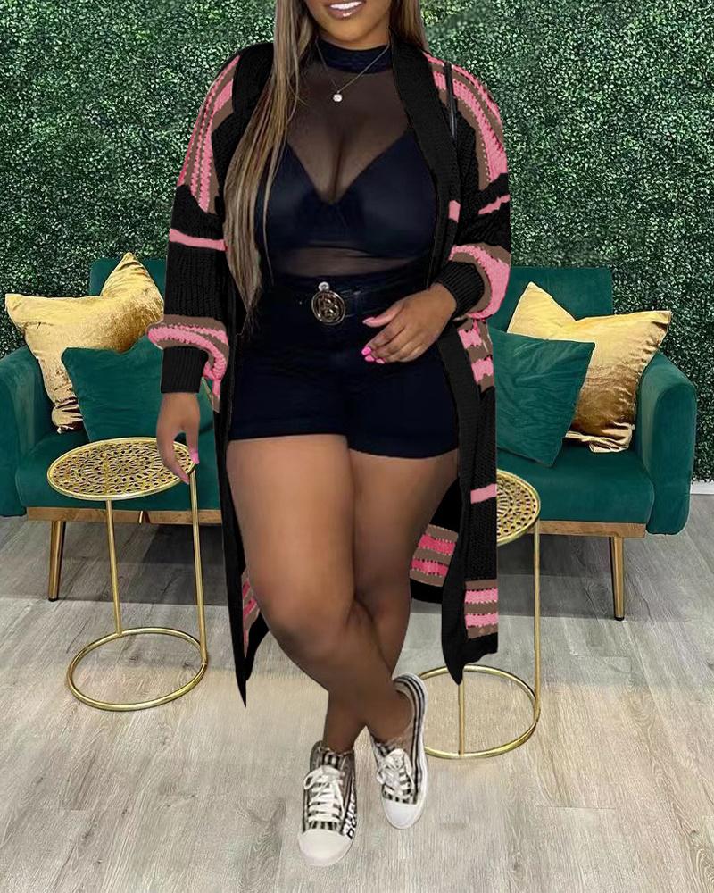 Striped Open Front Chunky Knit Longline Cardigan