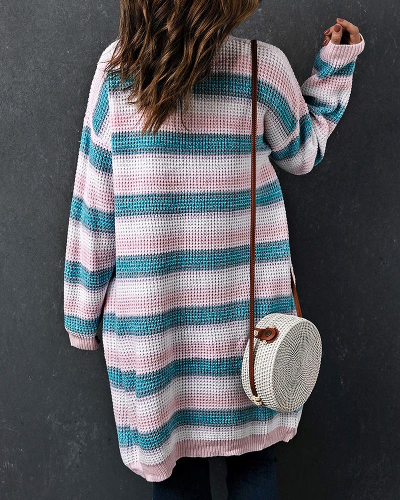Striped Pocket Design Longline Knit Cardigan