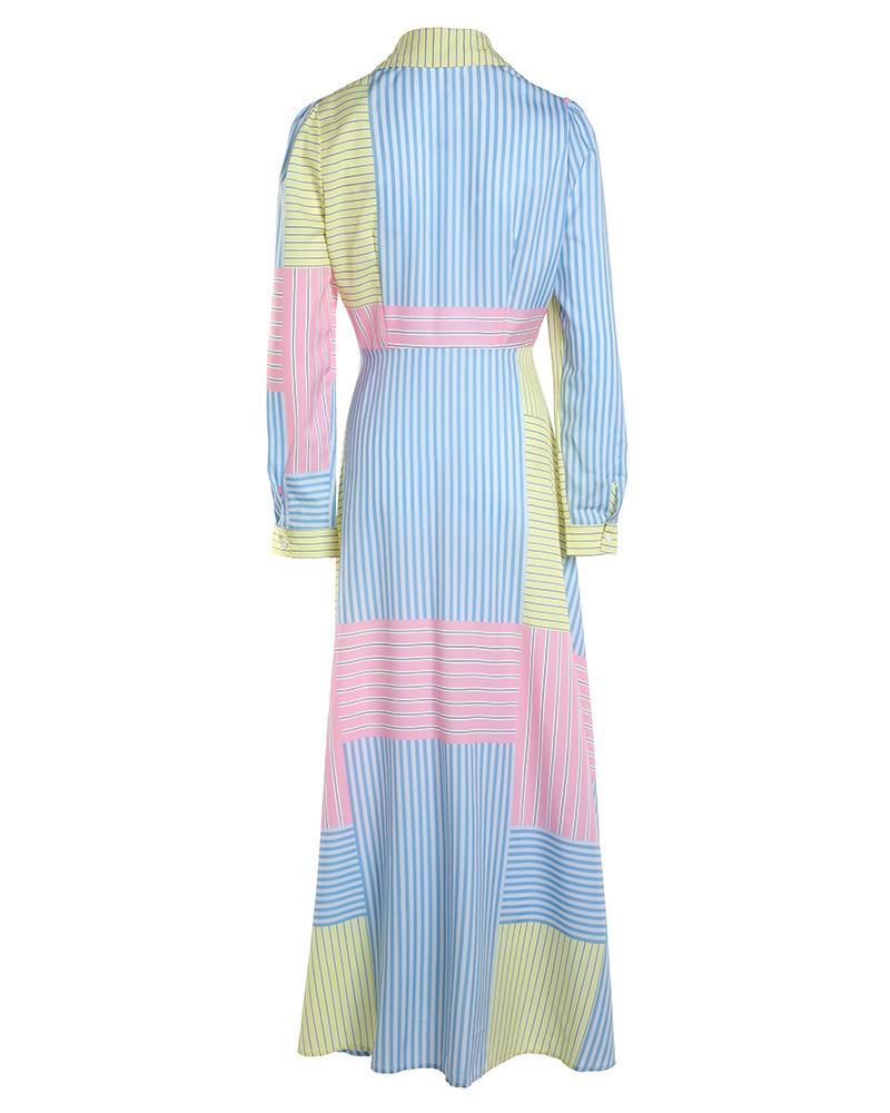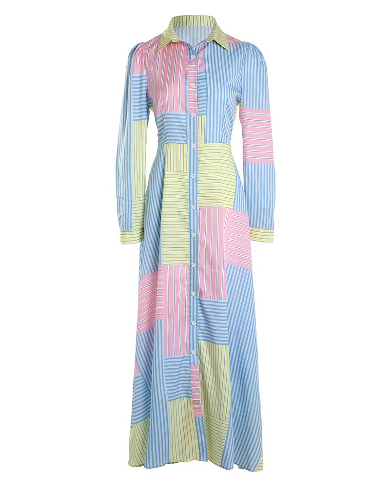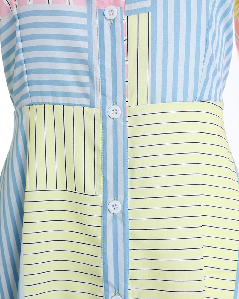 Striped Print Colorblock Puff Sleeve Shirt Dress