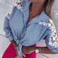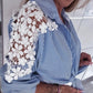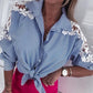 Striped Turn down Collar Long Sleeve Contrast Lace Shirt Casual Tied Detail Blouse