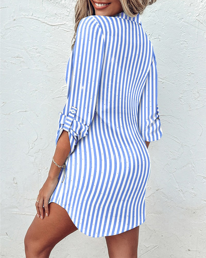 Striped Turn down Collar Rhinestone Shirt Dress Long Sleeve Buttoned Mini Dress