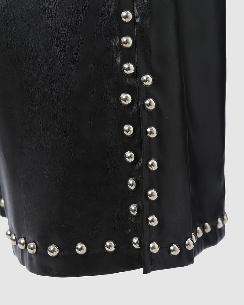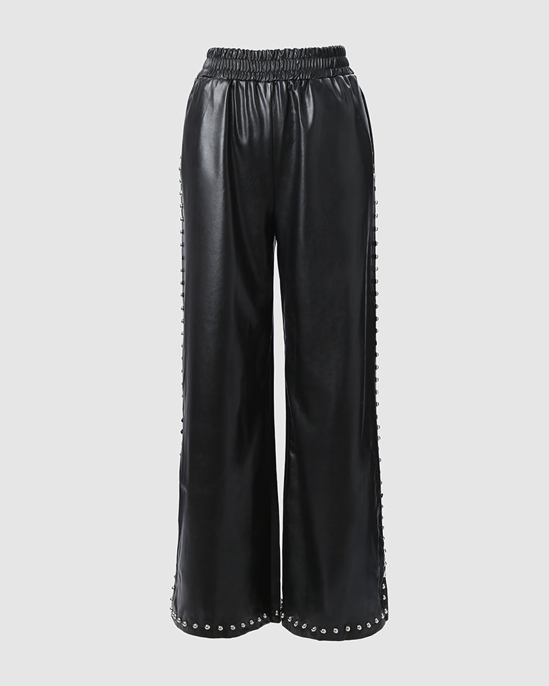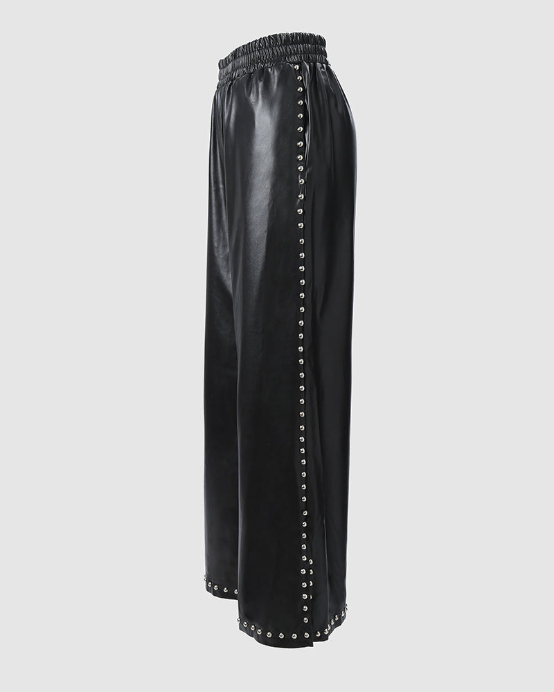 Studded Decor Pocket Design PU Leather Wide Leg Pants