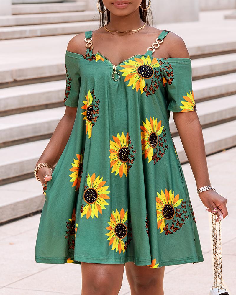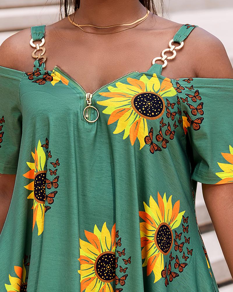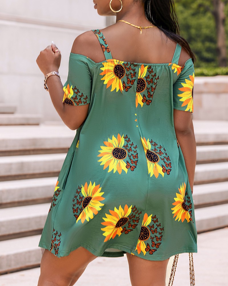 Sunflower Butterfly Print Cold Shoulder Swing Dress