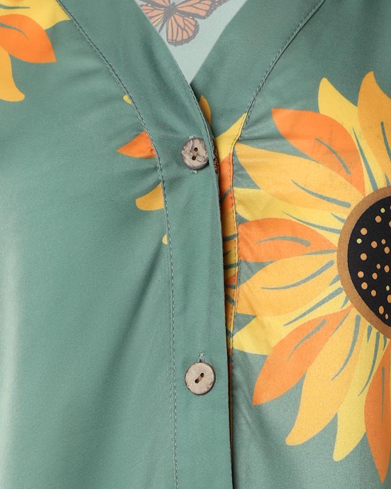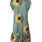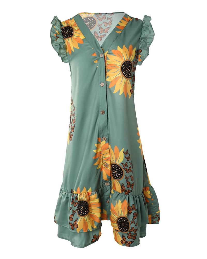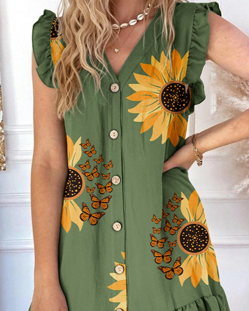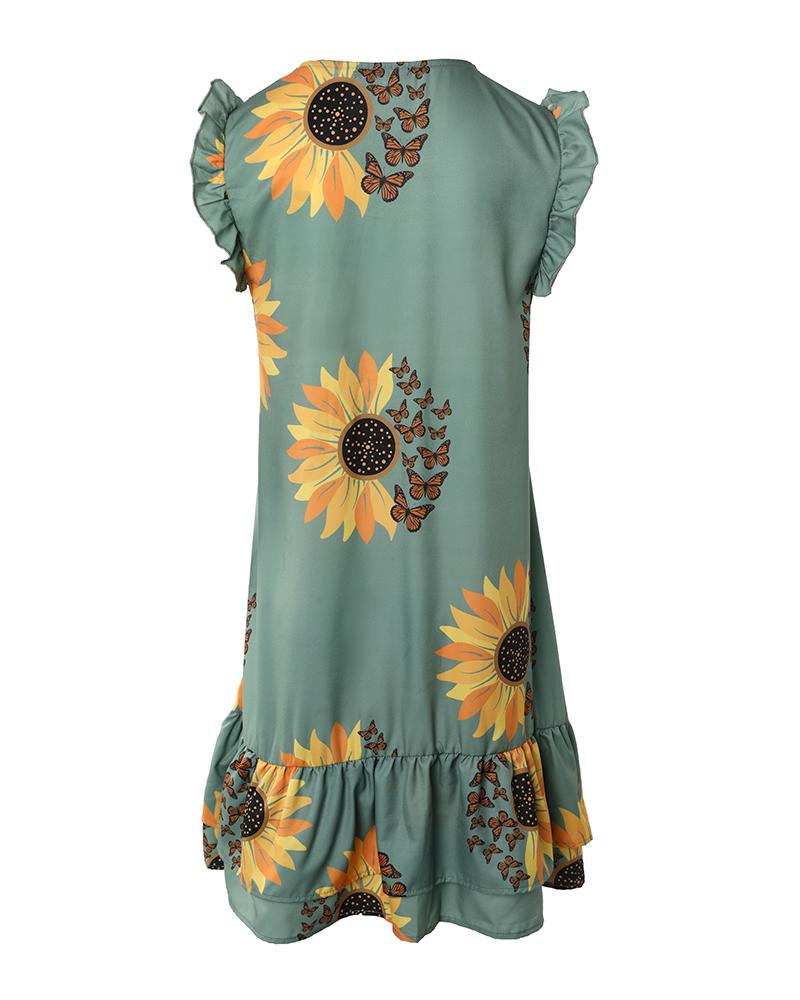 Sunflower Butterfly Print Ruffle Hem Casual Dress