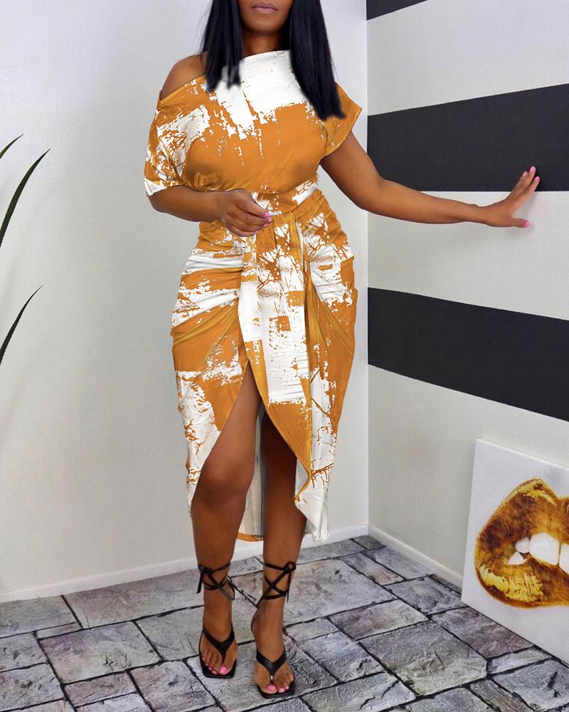 Tie Dye Print Draped Ruched Slit Casual Dress