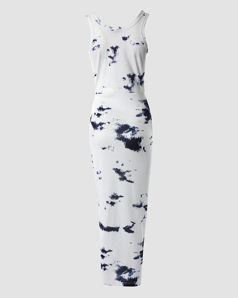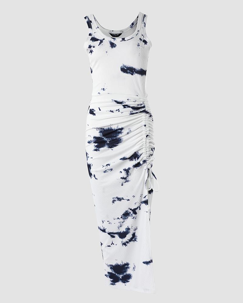 Tie Dye Print Ribbed Drawstring Ruched High Slit Dress