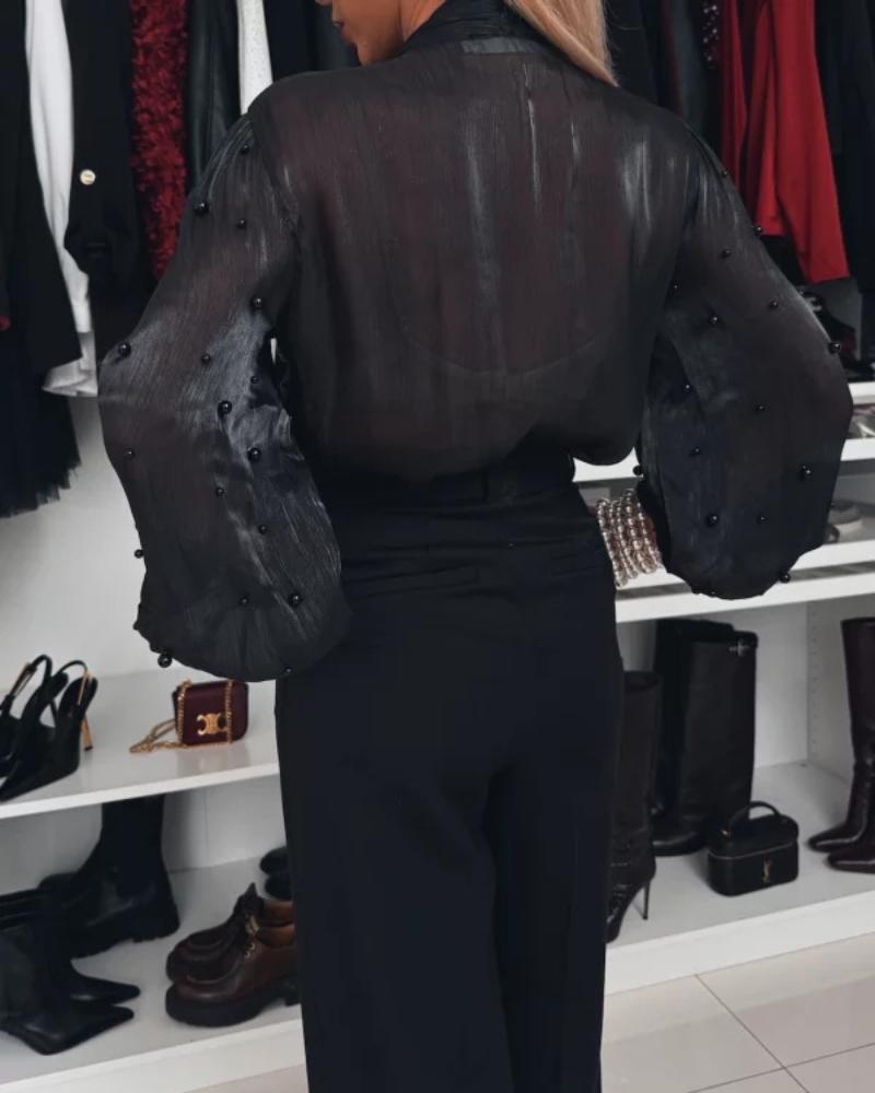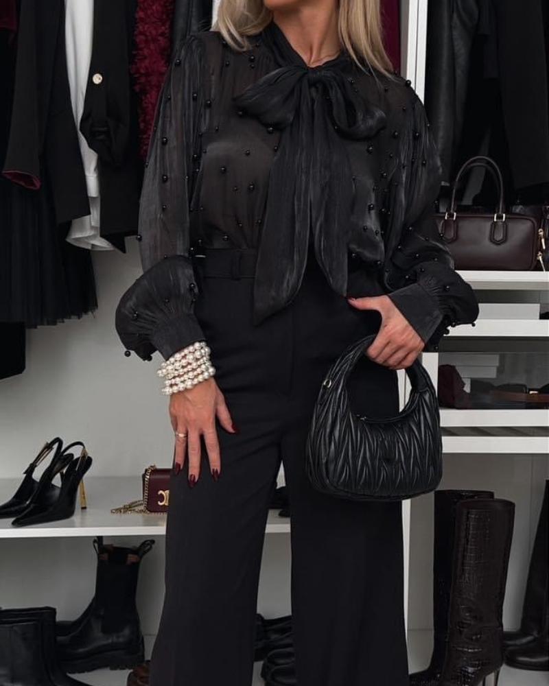 Tie Neck Beaded Long Sleeve Tied Detail Blouses Casual Shirts
