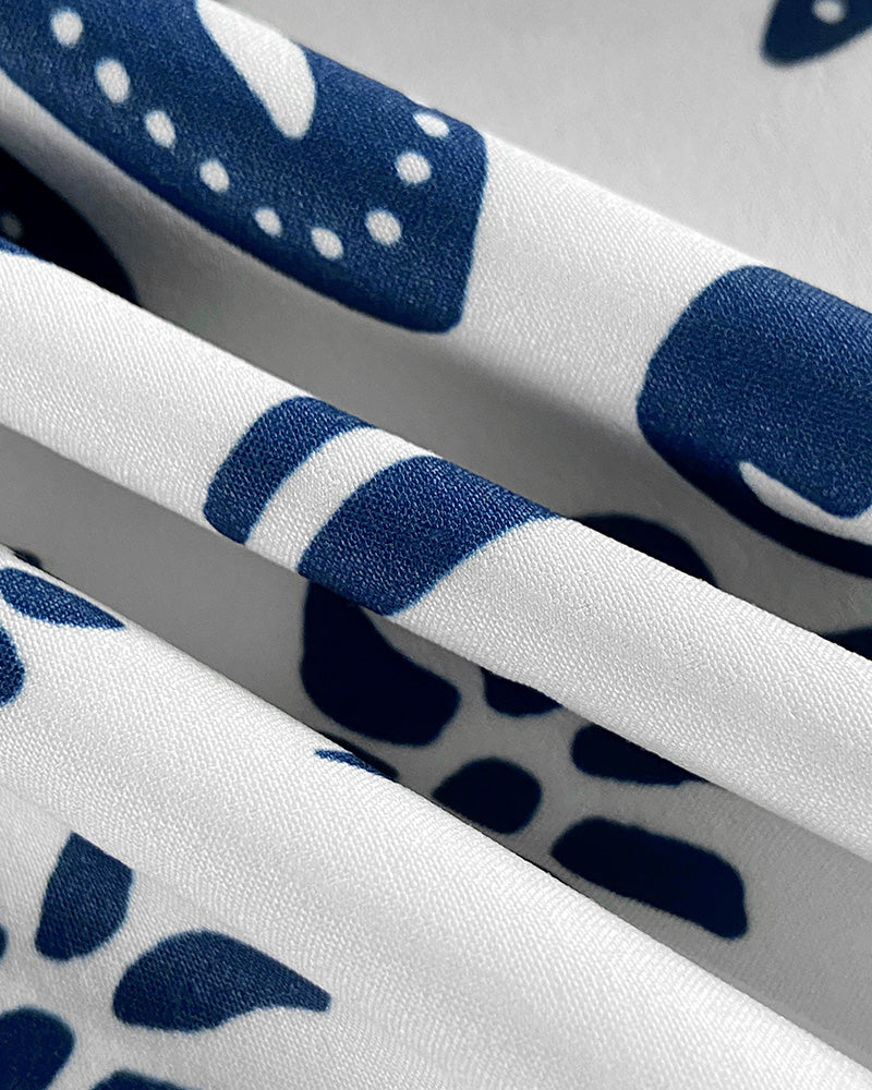 Tropical Plants Print Square Neck Backless Romper Elastic Waist Back Side Slit Short Jumpsuit