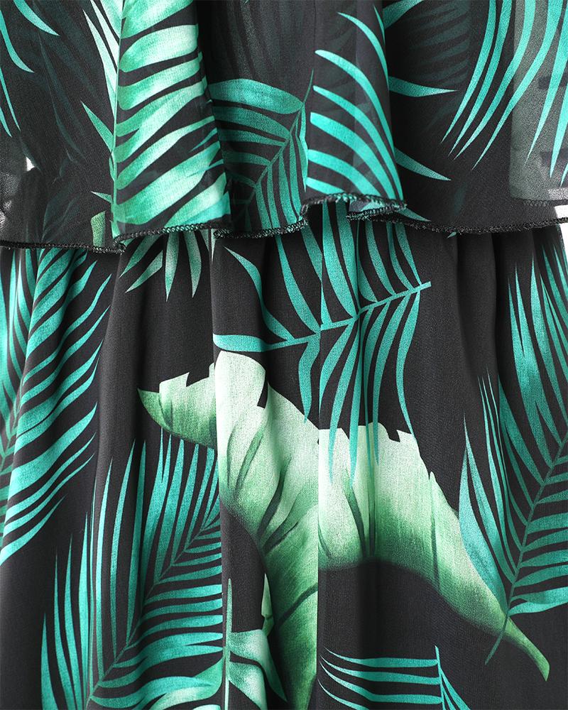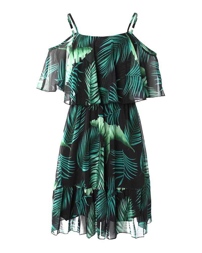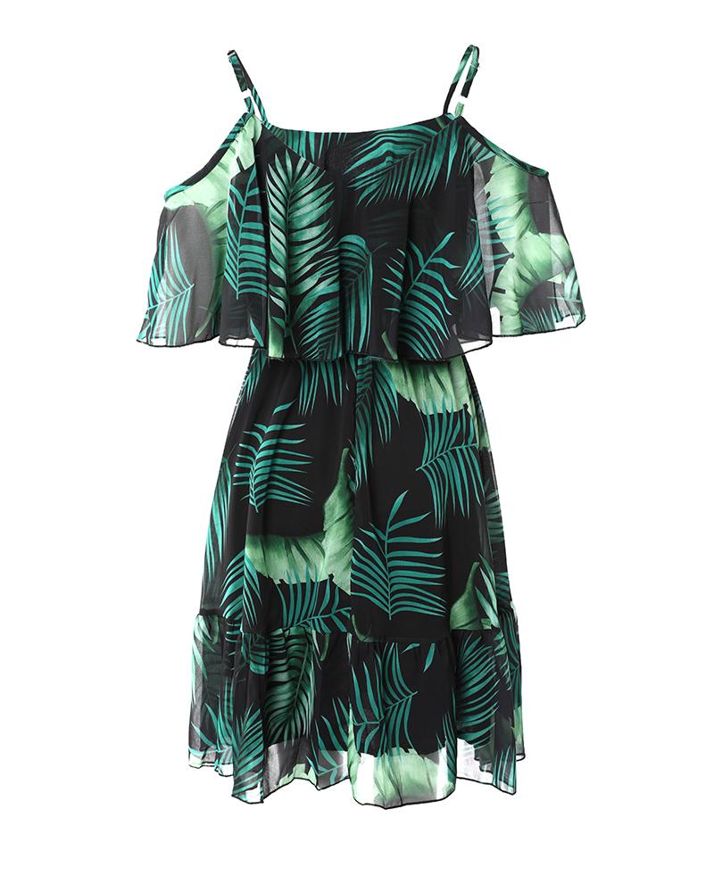 Tropical Print Cold Shoulder Ruffle Hem Casual Dress