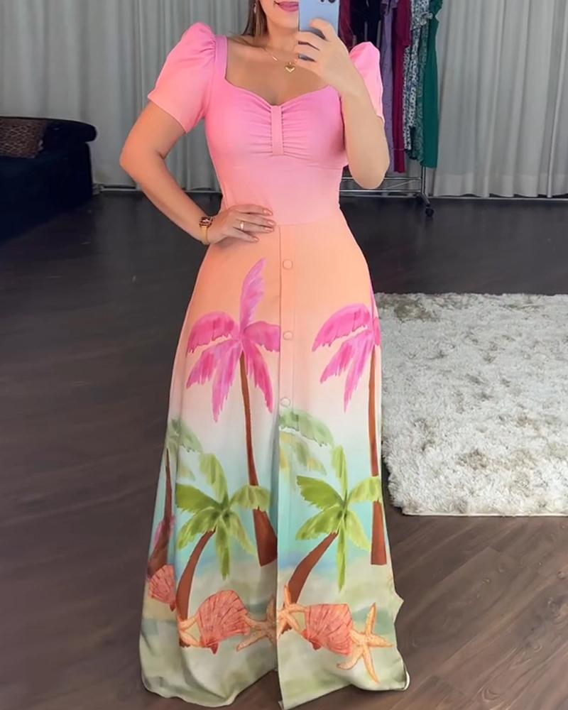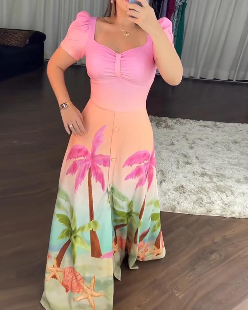 Tropical Print Sewatheart Neck Puff Sleeve Botton Front Slit Long Sleeves Vacation Dress