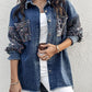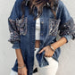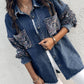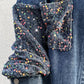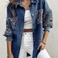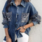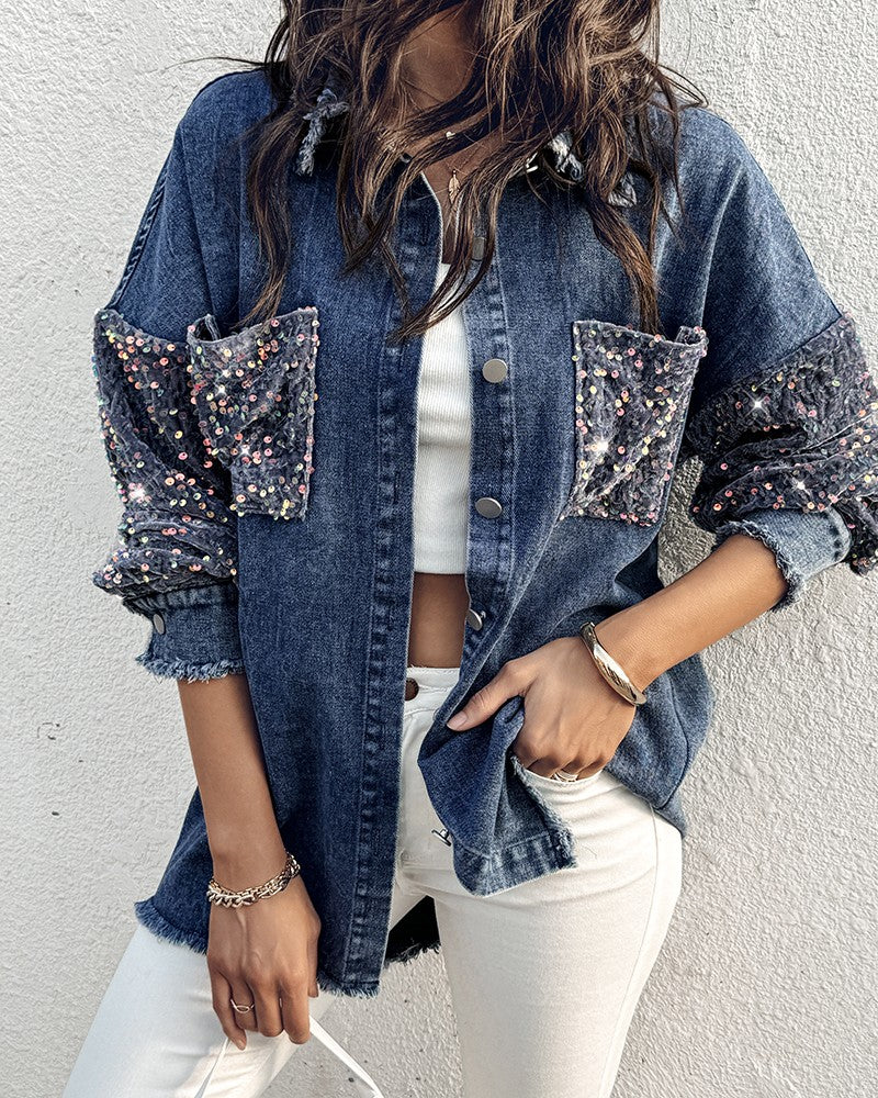 Turn down Collar Contrast Sequin Long Sleeve Fringe Hem Denim Jacket Casual Coat