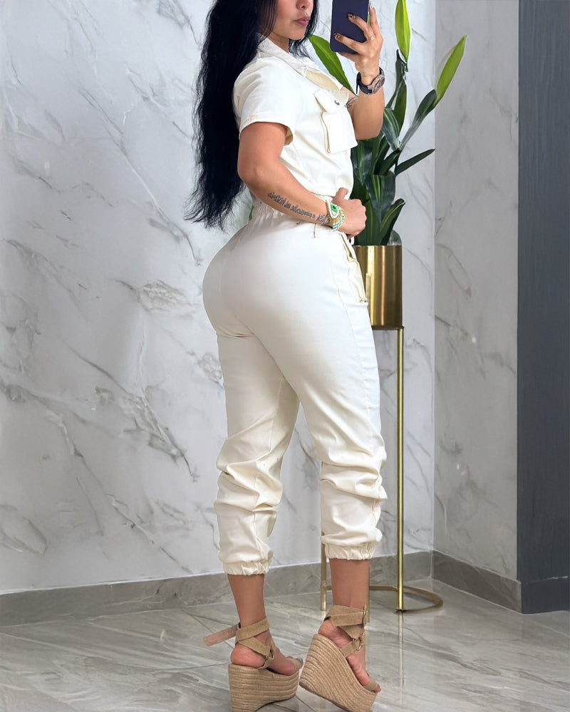 Turn down Collar Short Sleeve Overalls Drawstring Waist Casual Slim Fit Cargo Jumpsuit With Pockets
