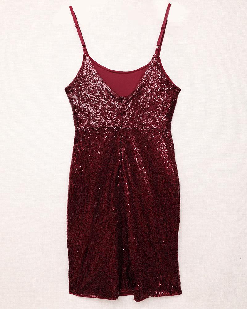 U Neck Side Slit Spaghetti Strap Sequin Dress