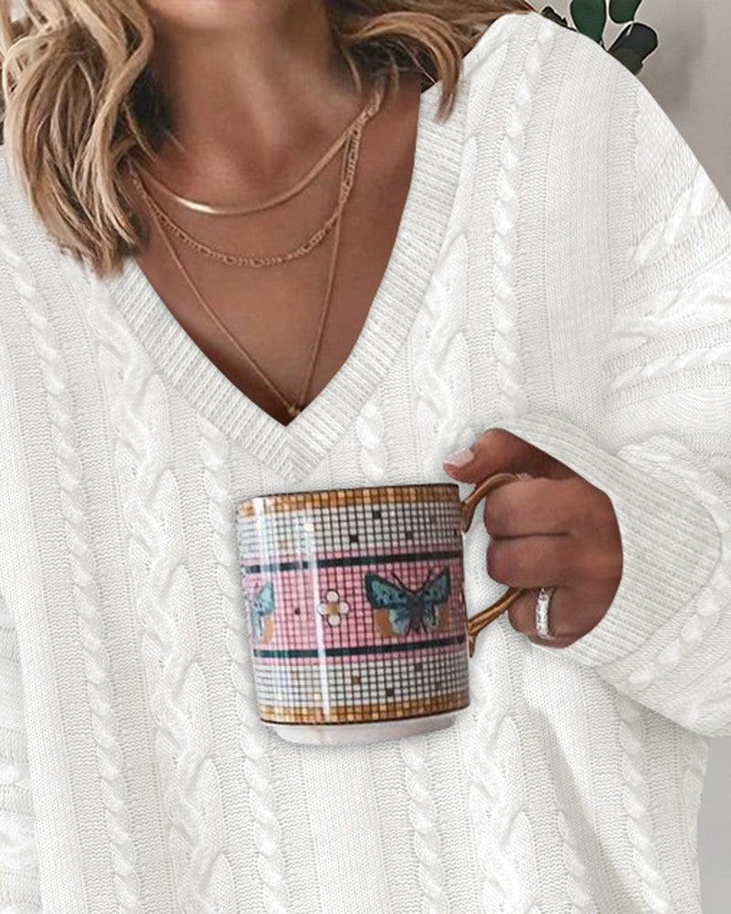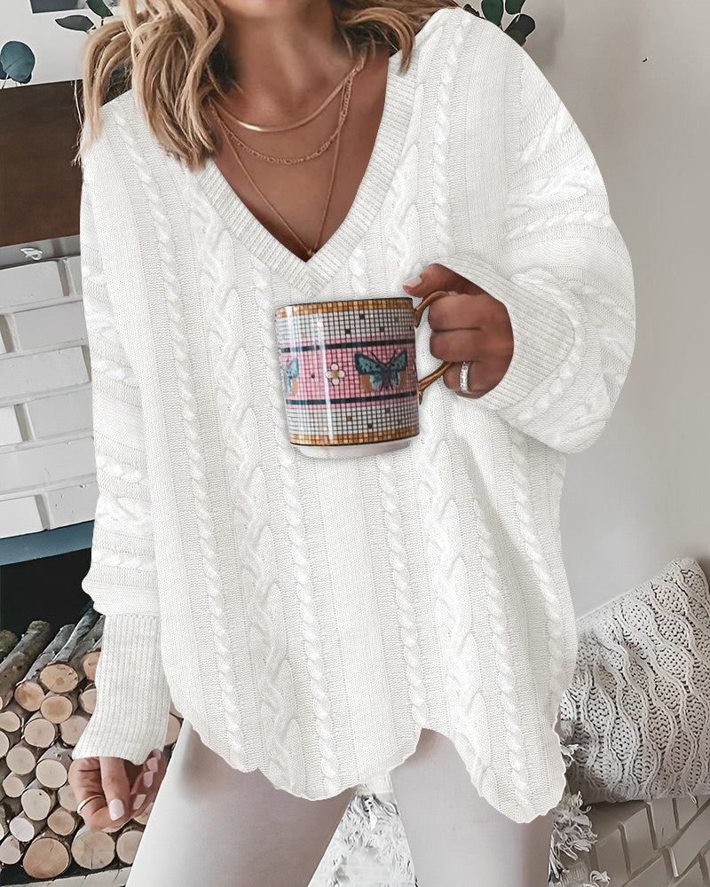 V Neck Asymmetrical Braided Knit Sweater