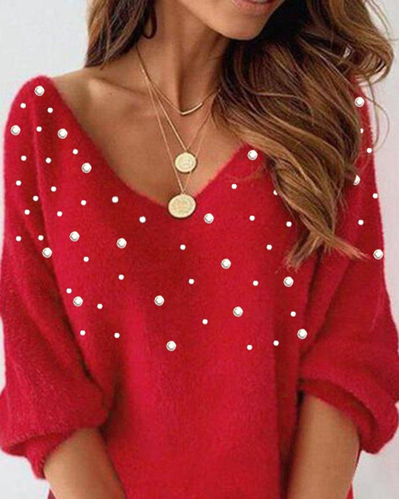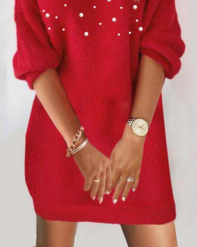 V Neck Beaded Fuzzy Fleece Casual Dress