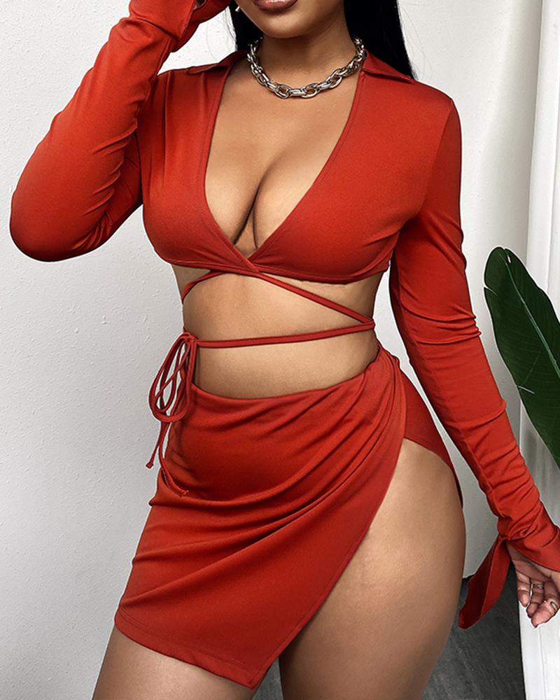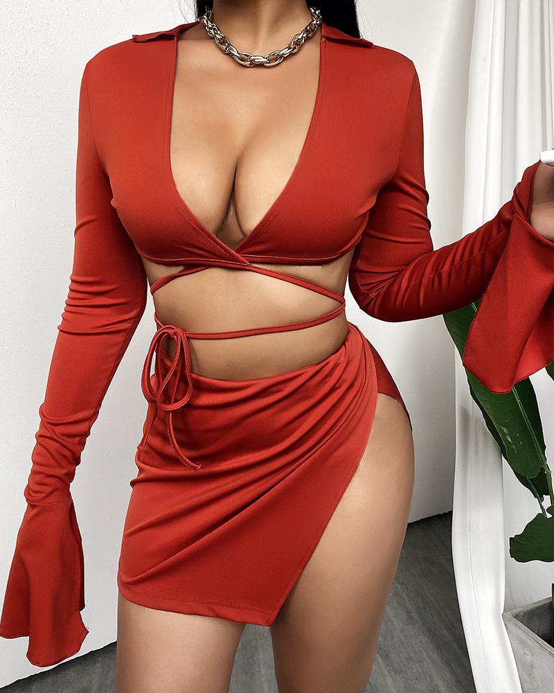 V Neck Criss Cross Tie Slit Flounce Sleeve Crop Top