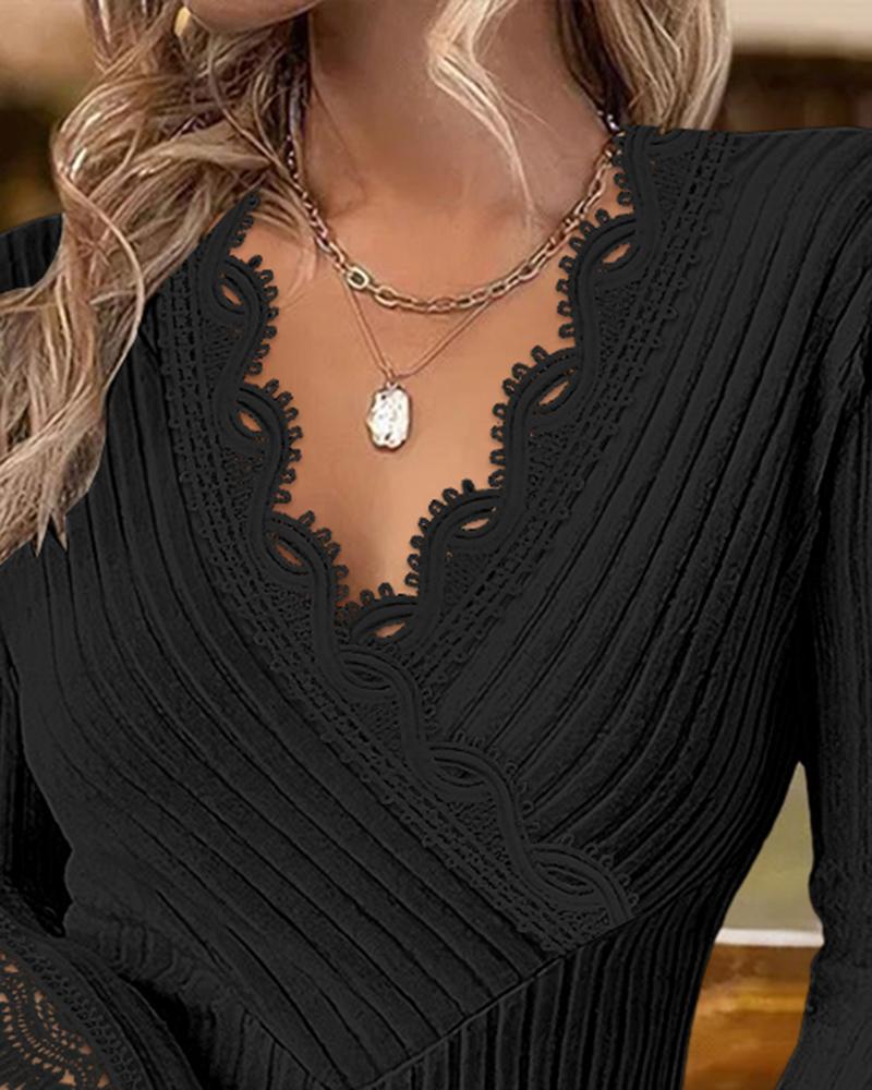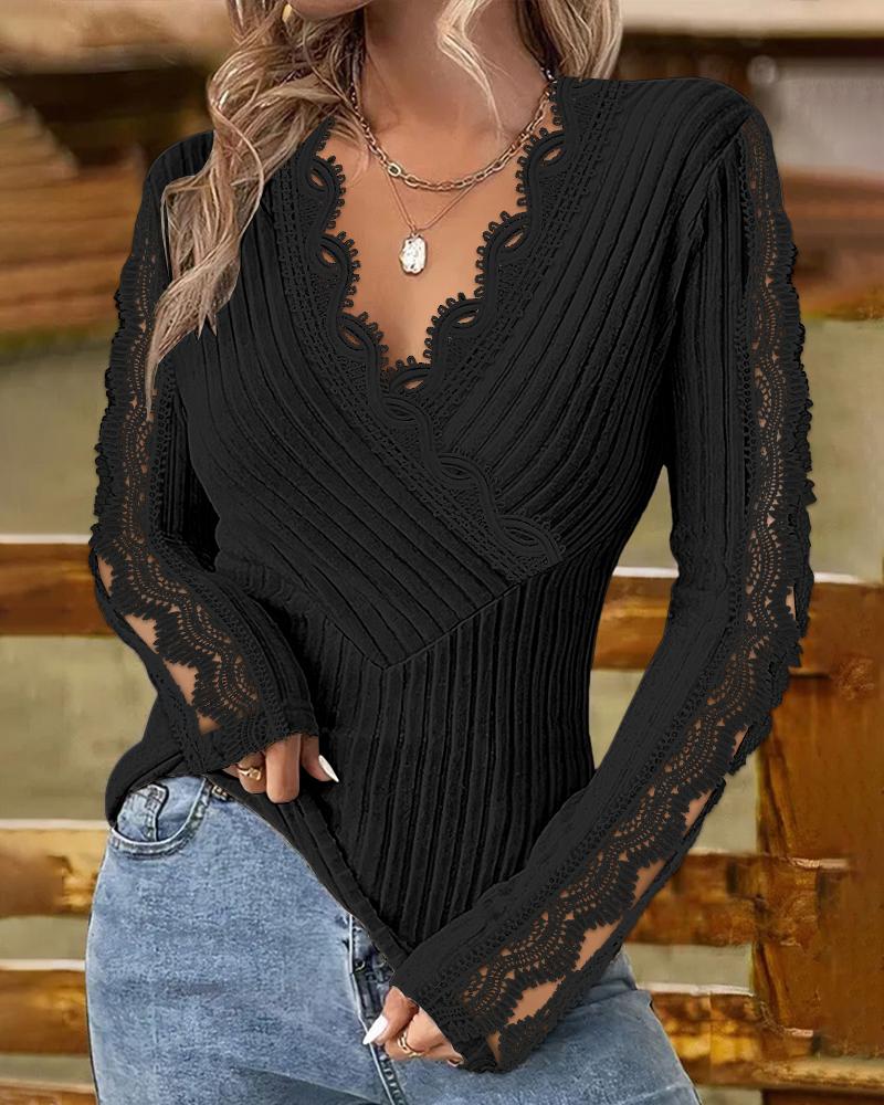 V Neck Lace Patch Long Sleeve Top