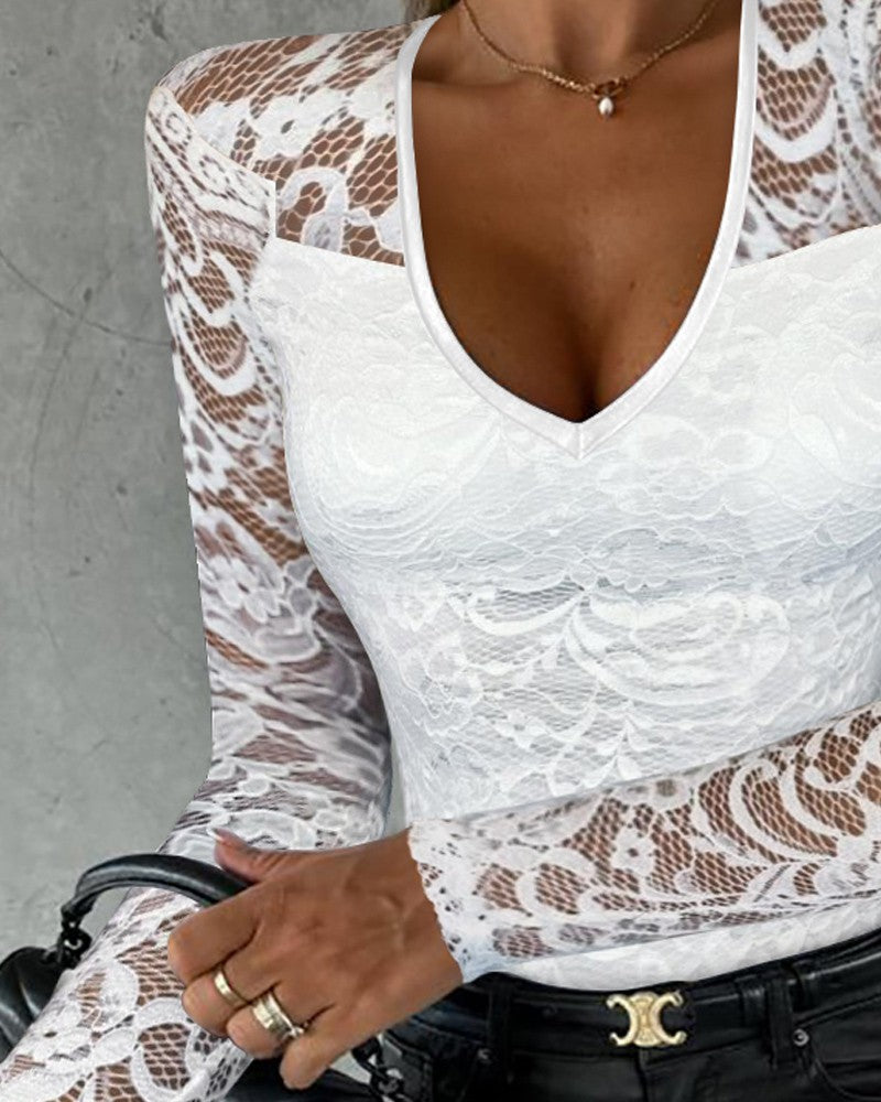 V Neck Long Sleeve Lace Patch Top