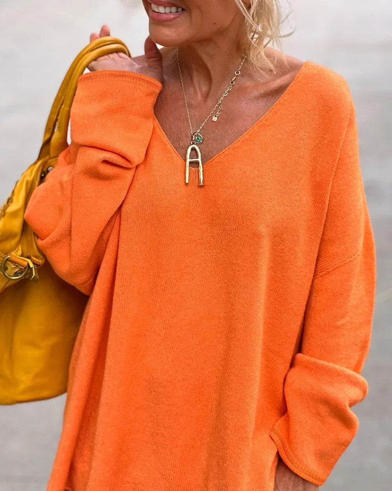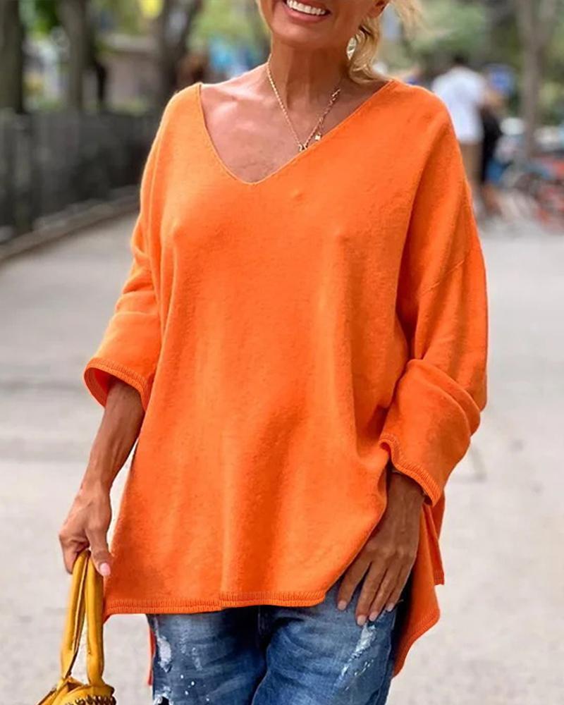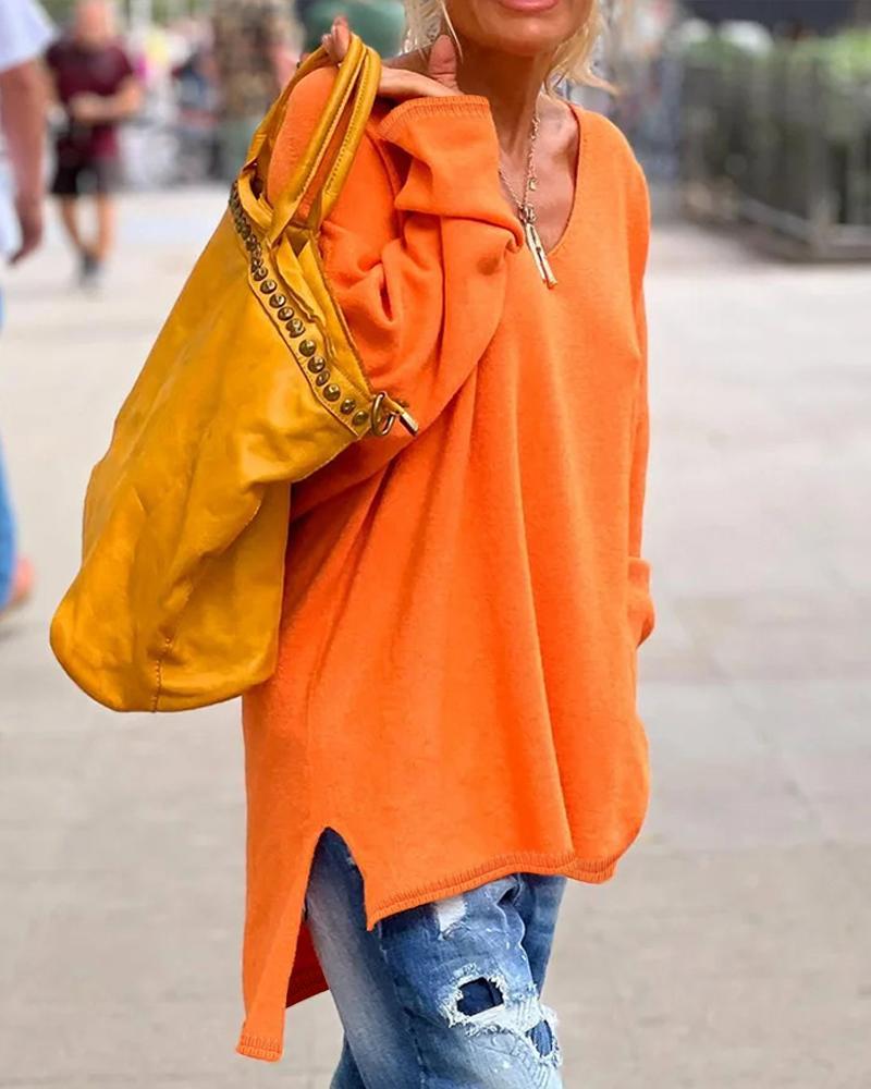 V Neck Long Sleeve Slit Casual Knit Sweater
