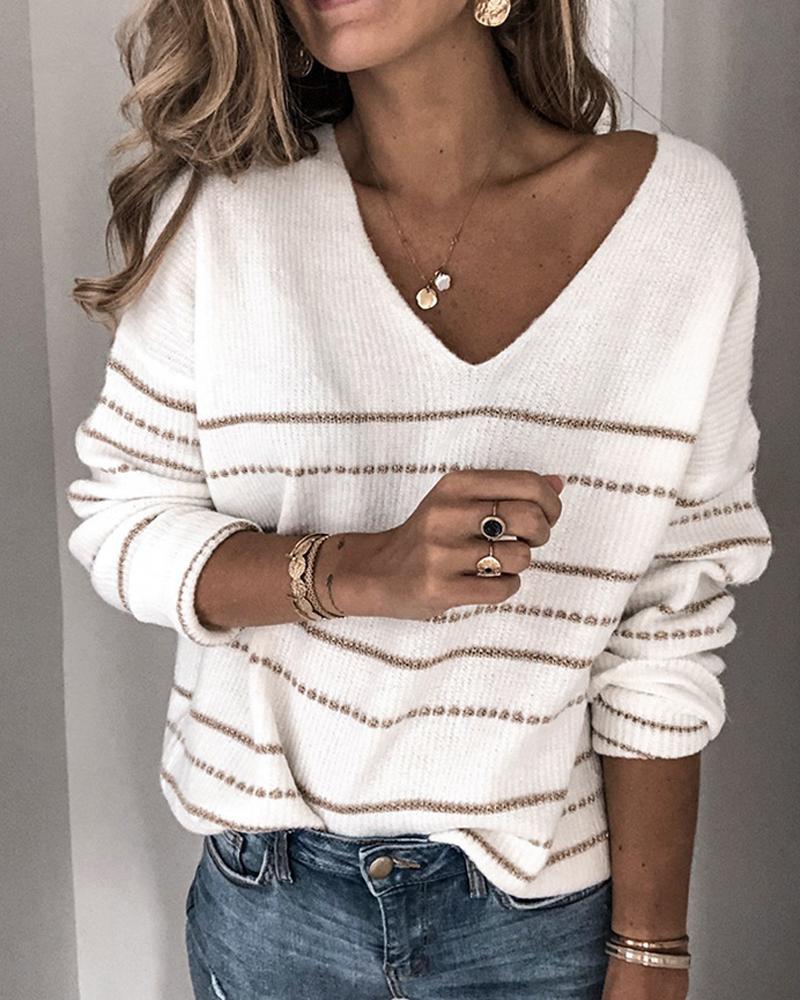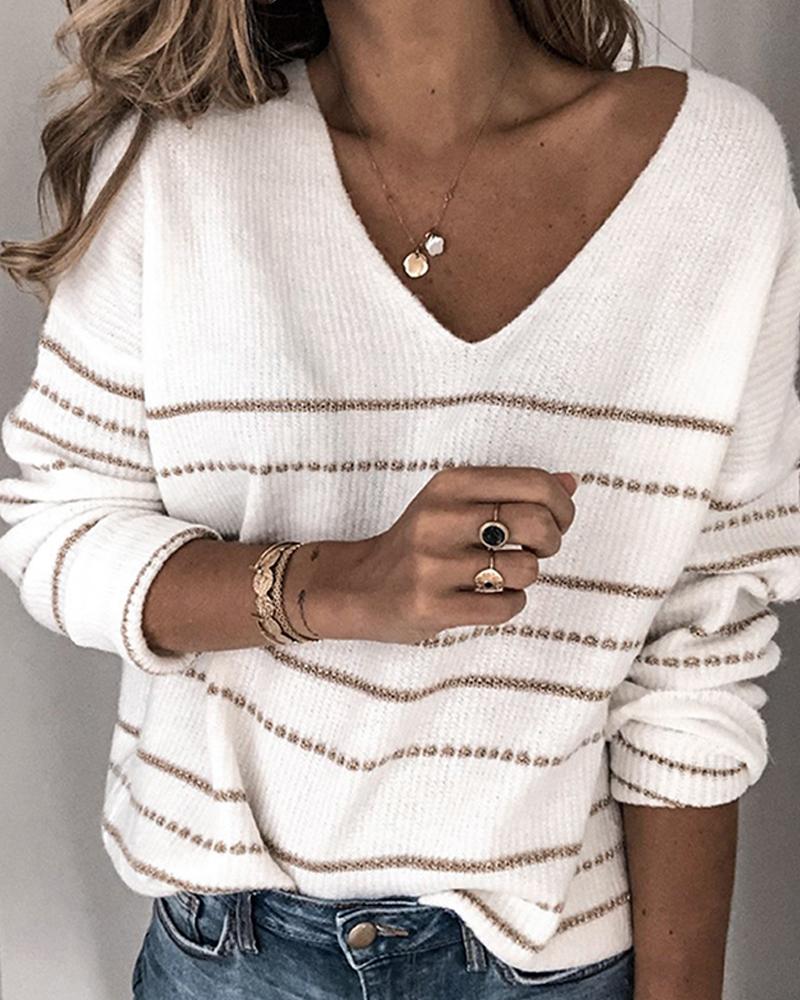 V Neck Striped Knit Sweater