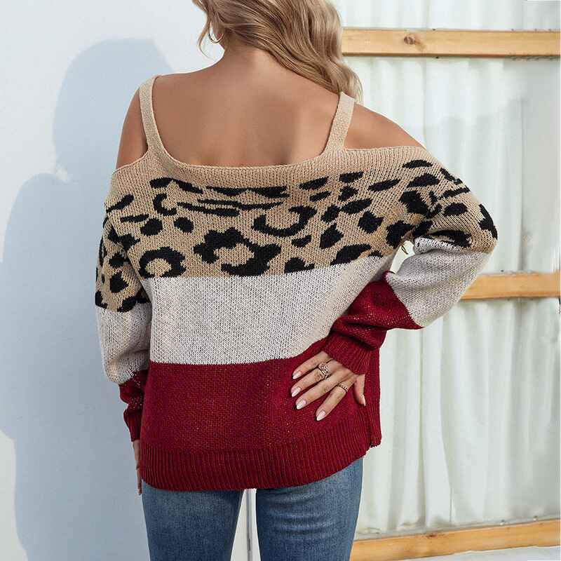 Women's Leopard Print Off Shoulder Sweaters Long Sleeve Cold Shoulder Warm Sweaters Casual Loose Fit Solid Pullovers Knit Jumper K233
