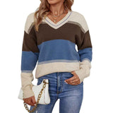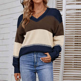Women's Casual Long Sleeve Knit Sweater V Neck Striped Pullover Jumper Tops K274