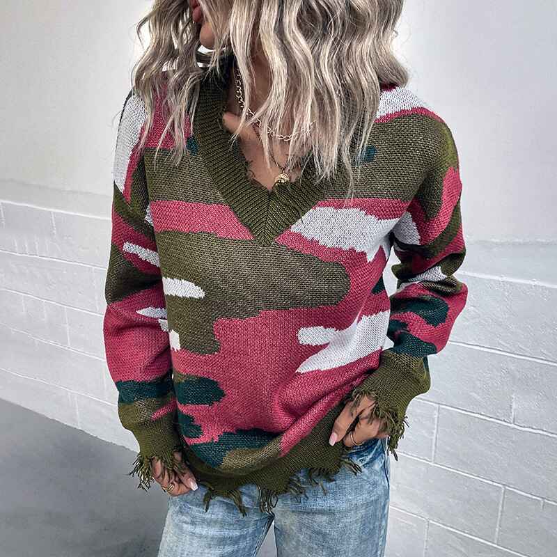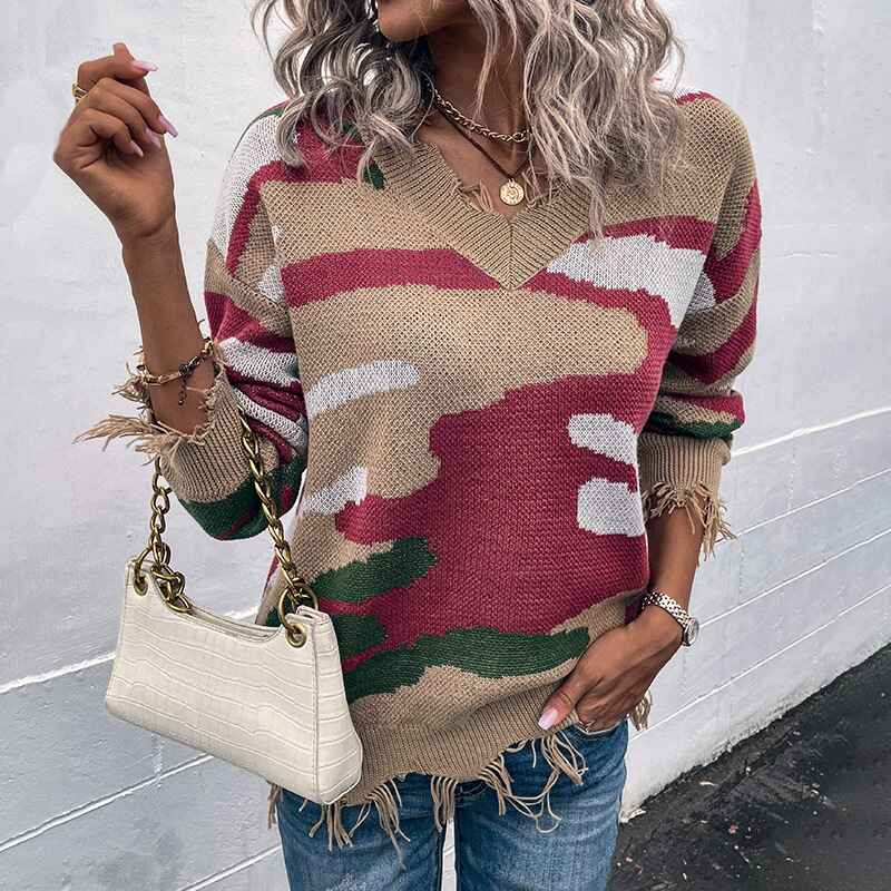 A stylish Women's Sexy Loose V Neck Ripped Knitted Pullover Crop Sweater Top K454