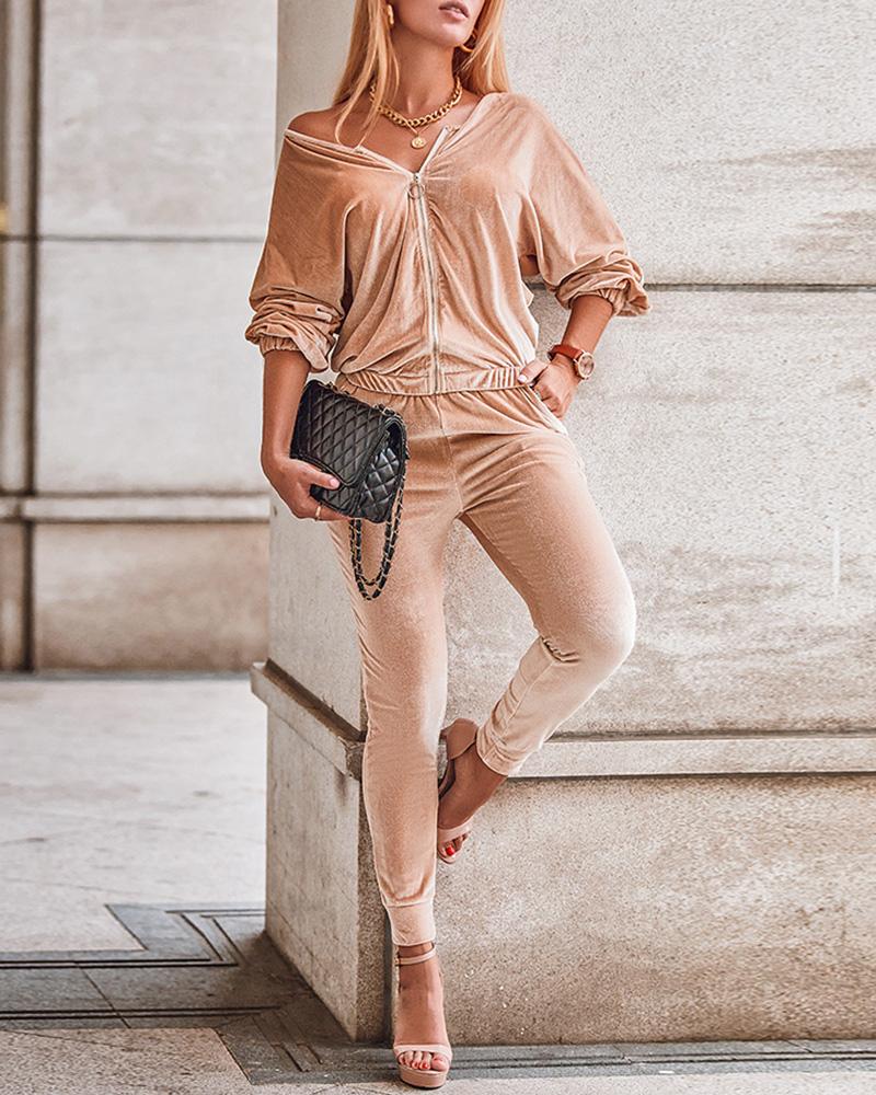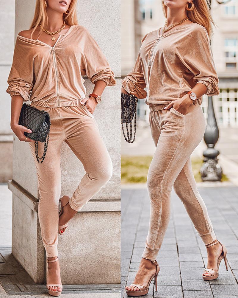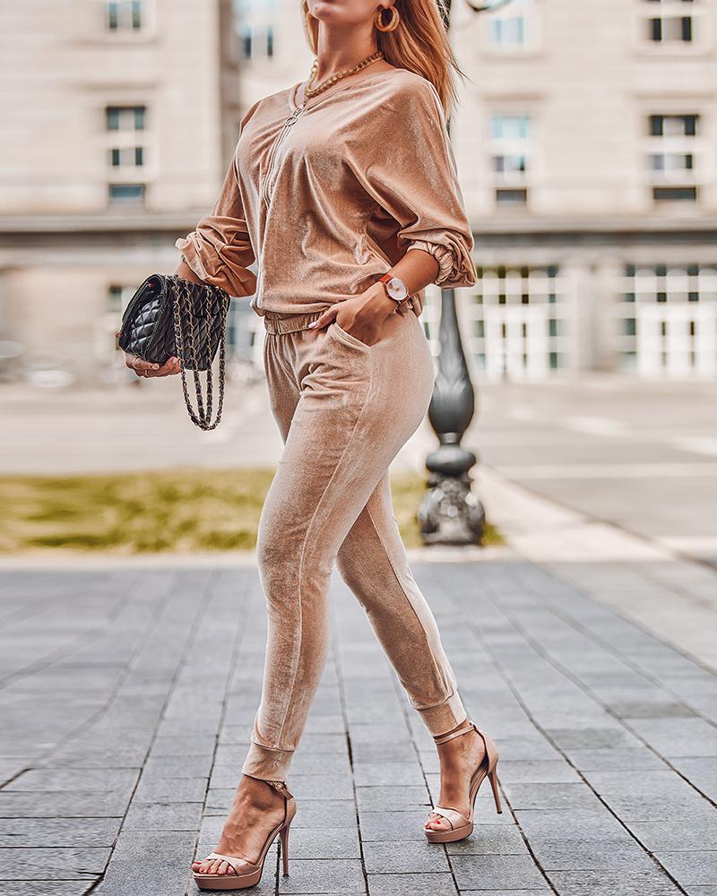 Velvet Lantern Sleeve Top & Pocket Design Pants Set